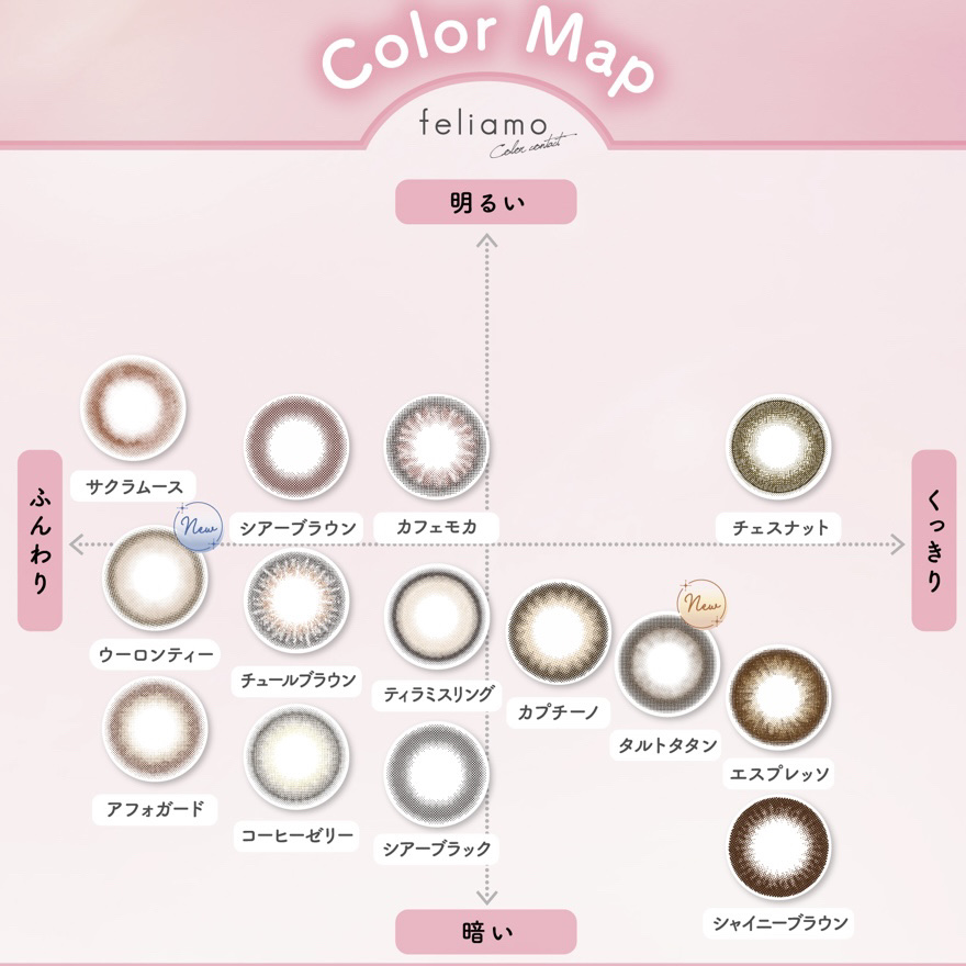 - ※2025年6月以降、商品パッケージ裏面・側面の一部表記を順次変更いたします。尚、これにかかる商品の交換・返品は承っておりません。 どんな瞬間にも溶け込む誰からも愛される瞳へ feliamoの由来は felice amore~幸せな愛~ 瞳から愛されオーラを放つ好印象レンズで女性らしさと品を演出。 オンも、オフも、特別な日も。 どんな場面にも溶け込むレンズラインナップで誰からも愛される瞳に。 UV CUT Feature1 肌や瞳に有害といわれ、白内障などの眼病を引き起こす危険性のある紫外線を99%カットします。(UV-A波75%、UV-B波99%カット) イオン性 Feature1 水分を多く含み酸素を通しやすいため瞳にやさしい使い心地で、快適な装用感です。 高含水 Feature1 水分が多く含むやわらかい素材で、快適なつけ心地です。 レンズ構造 Feature1 まぶた側に着色剤を内包しているため、角膜に色素が触れることがない構造を採用しています。 レンズ形状 Feature1 フチを丸みのある形状にすることで自然な装用感を実現しました。 ※装用感には個人差があります。 カラーコンタクトレンズの不適正使用による眼障害の危険性等などがあります。 ●コンタクトレンズは高度管理医療機器です。不十分な洗浄・消毒など不適切なケアや、長時間・交換期間を超えた装用により、アレルギー性結膜炎、角膜感染症、角膜潰瘍等の重篤な眼障害が発生する危険性があります ●ご使用前に取扱説明書を確認してください 使用上の留意事項 ●眼科医院等を受診してからお求めください ●眼に異常を感じたら直ちにレンズ使用を中止し、お近くの眼科等で診察を受けてください ●医師の指示にしたがってご使用ください ●コンタクトレンズを装用する場合、自覚症状がなくても、眼科医院等での定期検査を受けてください ●レンズに不具合がある場合は使用しないでください