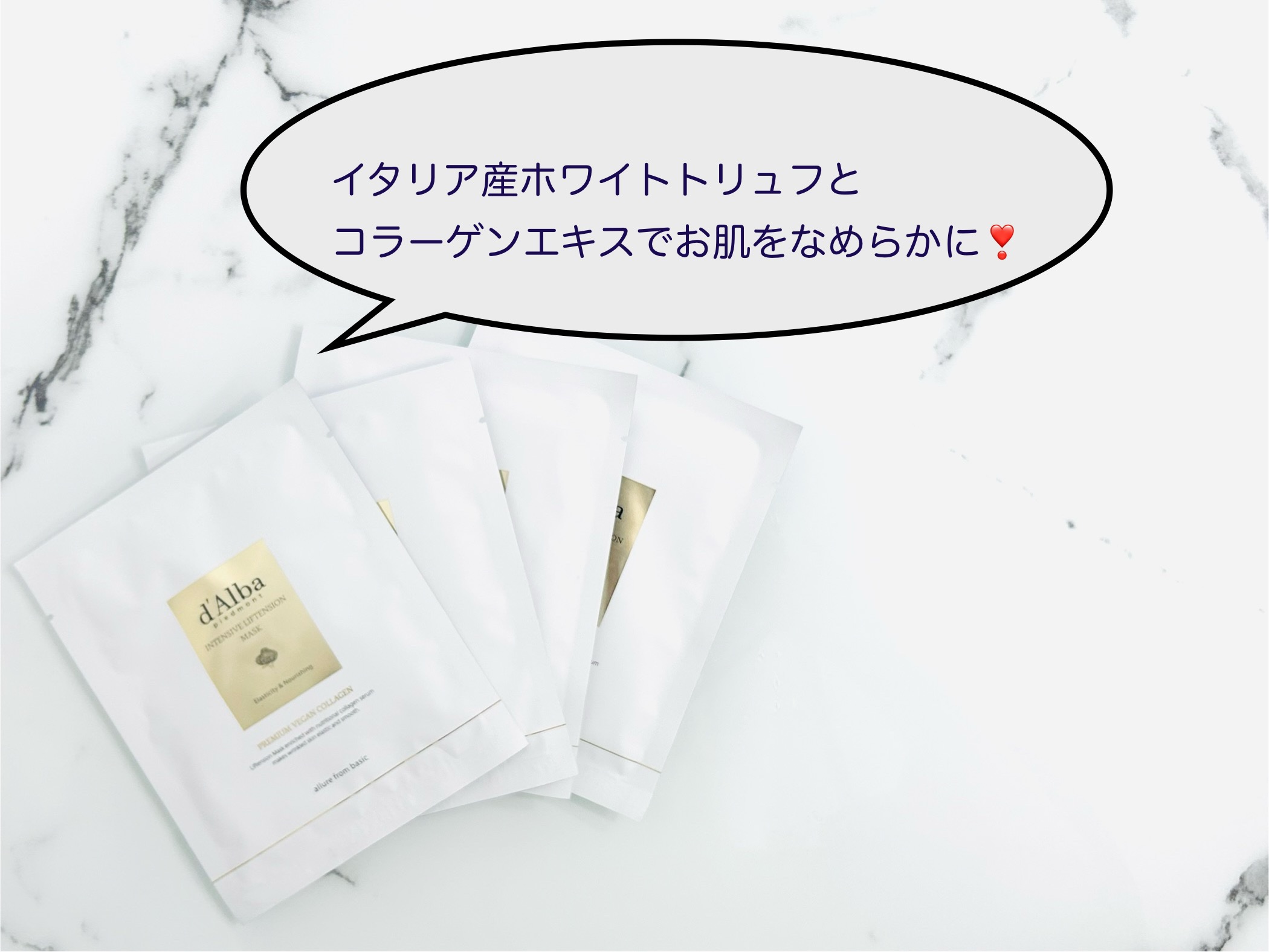 イタリア産ホワイトトリュフとコラーゲンエキスを含む濃縮セラムがたっぷり配合されたマスクです。 ひたひたの美容液がお肌に豊かな栄養と保湿を与え、肌をなめらかに整えてツヤのある肌に導いてくれます。 しっとりするのにベタつかず、使いやすいのでデイリーの乾燥対策として冬にちょうどいいなって思いました。