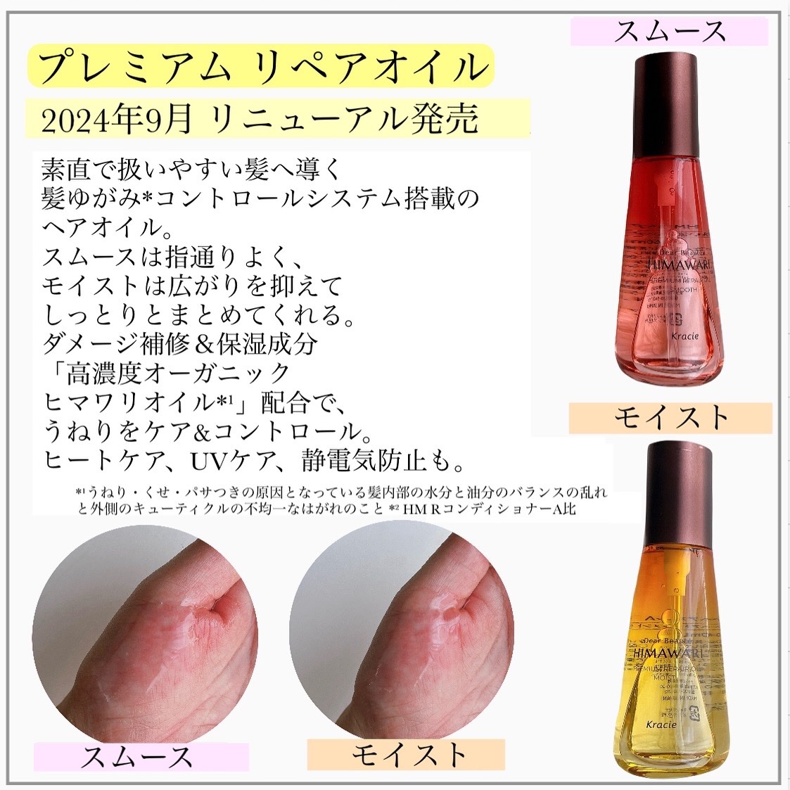 うねりやくせ、パサつきが気になる人におすすめで華やかなフローラルの香りがたまらなく好き💐 ミストやミルク、オイルなどを使い分けて自分の髪に合ったアイテムを選んでみてね🫧 ディアボーテ HIMAWARI*のリペアブローミスト、トリートメントリペアミルク、プレミアムリペアオイル(スムース)、プレミアムリペアオイル(モイスト)