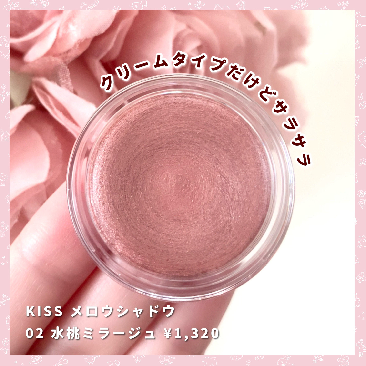クリームアイシャドウのようなテクスチャー。伸びやすく、瞼に密着する感じ。塗ったあとはベタつかずサラッとしました。 水桃ミラージュは微細パールのきらめきのGLOWタイプ。光の当たり方や見る角度の違いで、シェルピンクに見えたり、ピーチっぽく見えました。 春らしいカラーで可愛いです🫶 マットタイプのソメイピンクも気になる👀