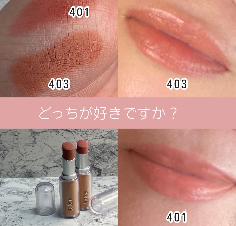 マットリップだけど、滑らかでに塗れて心地良い。ムチっとした感じがあり、乾燥し過ぎない。 昔からラカのヌーディーなミュートカラーは大好き。シャーロットテリブリーのピロートークが大好きで、化粧ポーチにいつも入れてるのだけど、ラカのこの子達も仲間に。 このカラーもリップだけでワントーンメイク出来そう。