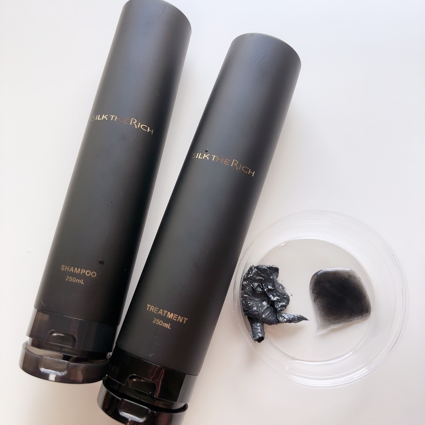 こだわりの3種のシルク成分と美容成分、さらに7種のスカルプ成分を配合した商品です。頭皮ケアにもよさそうなので使用するのが楽しみでした☺️細長い円柱状の容器で、デザインもシンプルでかっこいい感じです。シャンプーは真っ黒でとろみを感じるテクスチャ...