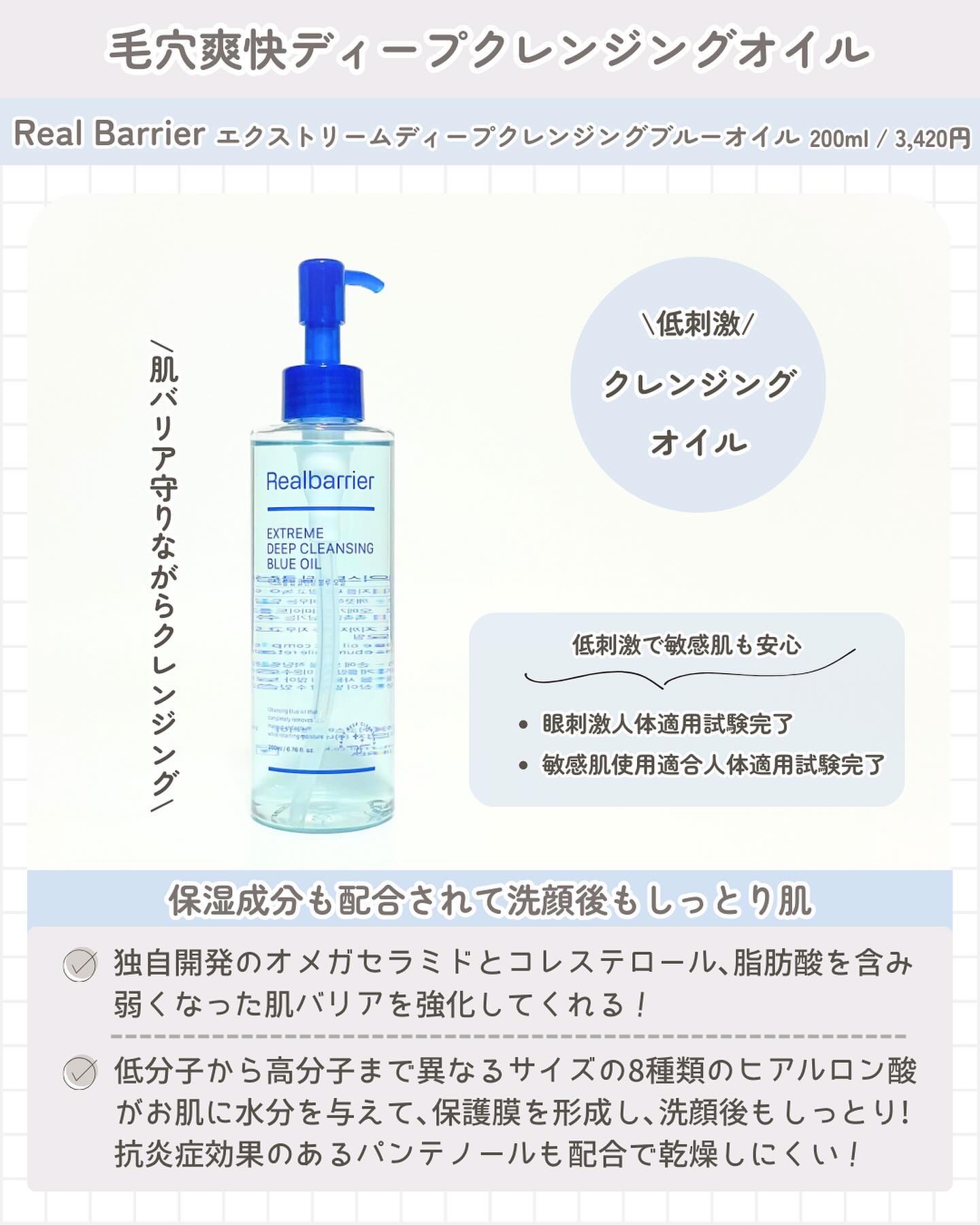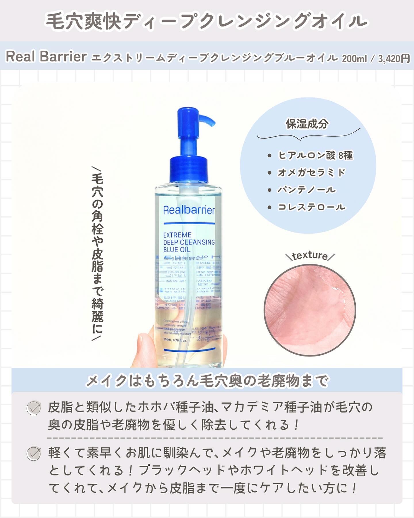 クレンジングでメイクから皮脂まで一度にケア! 今回ご紹介するのは、リアルバリアのエクストリームディープクレンジングブルーオイルです🩵 8種類のヒアルロン酸(保湿成分)配合で、うるおいをうばわずにしっかりメイクを落とせます🫧 軽めなテクスチャーのクレンジングオイルです✨