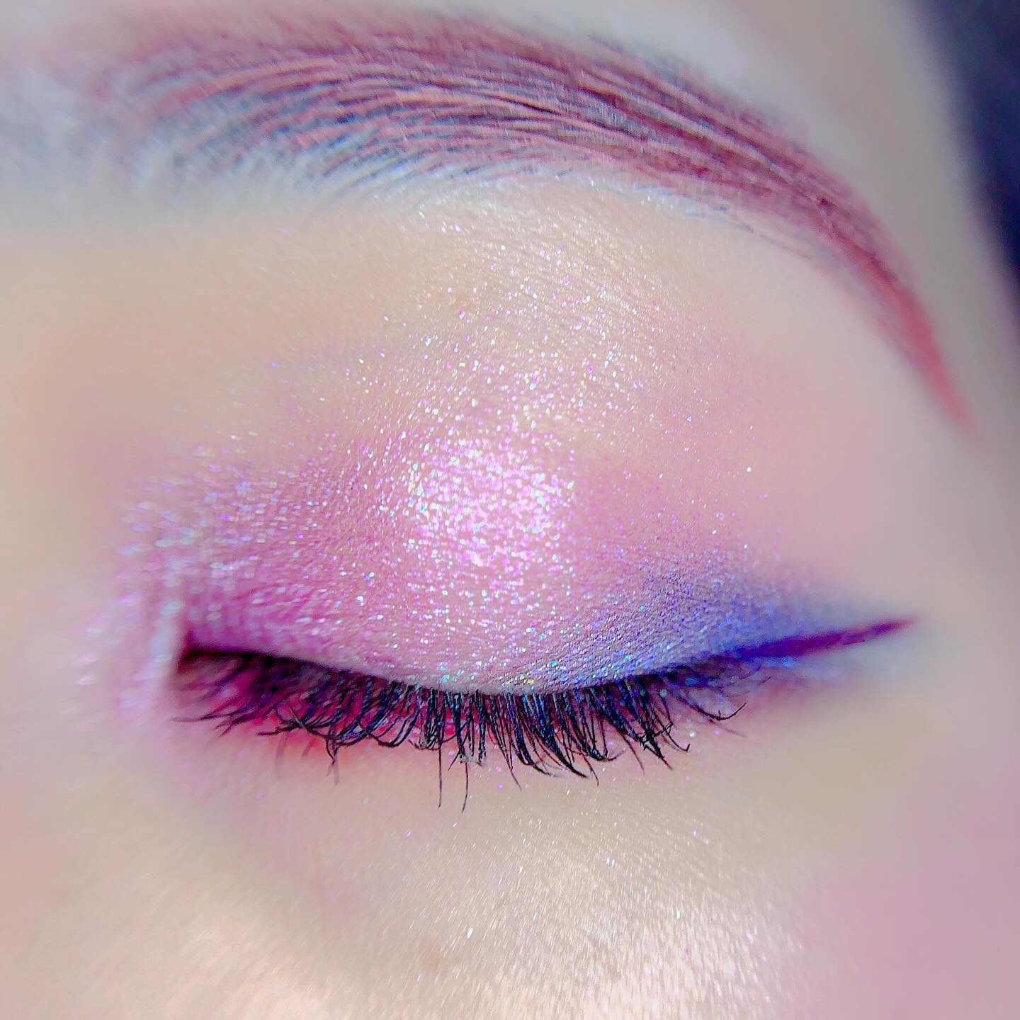 ベースに右上、目頭から黒目上に真ん中、黒目〜目尻に右下を、左上を目頭にくの字に塗ってもらいました✨ ピンクサクラよりもクールな感じで、目で見た色より私の肌では紫っぽく発色しました😍 上2つはラメはぎっしりでときめく💓 ブラウンメイクがとても苦手だけれどこれならブラウンメイク出来そう👌(かなり紫寄りですが) くすみ感は強いので苦手な方は厳しいかも…(特に真ん中) クールな印象になるので大人顔さん向けor大人顔になりたい方向けのイメージです✨