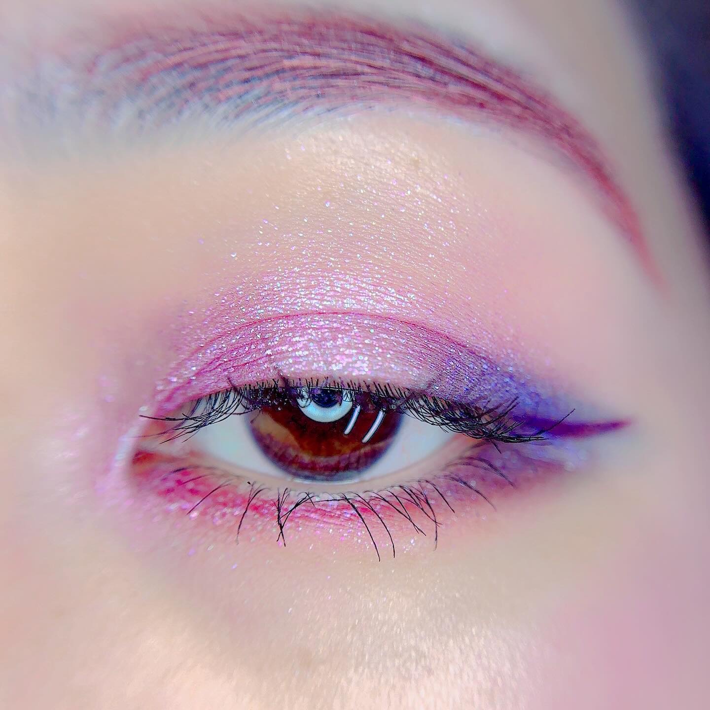 ピンクにグレージュも良いですね👌💗 今日は可愛らしい感じにしてみました💕 上下瞼黒目〜目頭側にラメを塗ってキラキラさせております🤩 目尻はマットのピンクを濃いめに重ねて💗 グレージュのアイライナーと相性◎