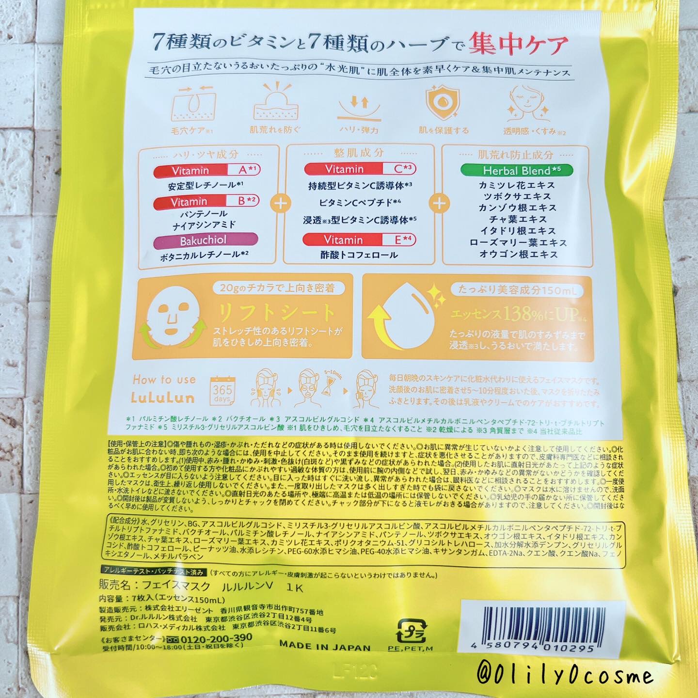 - ルルルンからビタミンたっぷりの化粧水フェイスマスクが新登場。 7種類のビタミン※1と7種類のハーブ※1で肌全体を素早くケア&集中肌メンテナンス。 新開発のフェイスラインに密着するシートで肌を引き締めながら肌のすみずみ※2までうるおいで満たし、毛穴の目立たないうるおいたっぷりの“水光肌”へ。 (※1 全て保湿成分として ※2 角質層まで)