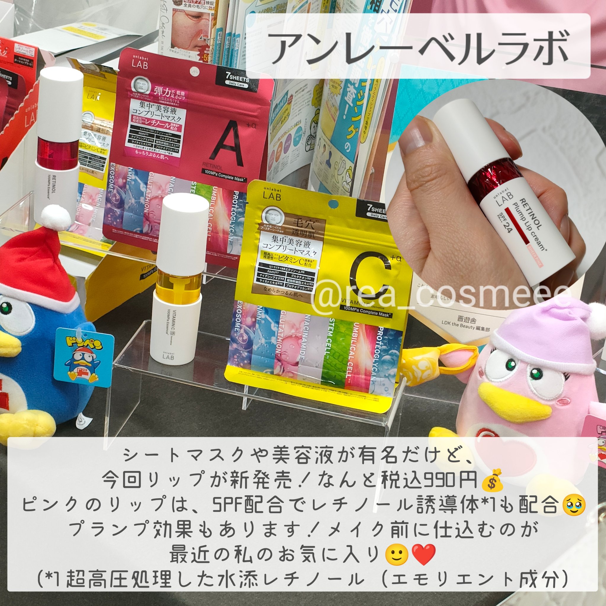 美容液成分80%以上と高保湿 SPF24 PA++ ふっくら弾力が欲しい方におすすめのレチノール配合⁂ UVケアもできるリップクリームなので、唇の日焼けも気になる方におすすめ! ちょっとスースーするけどもちもちぷるんって感じの唇に見せてくれるのでナチュラルメイクにもってこいのリップだと思います。