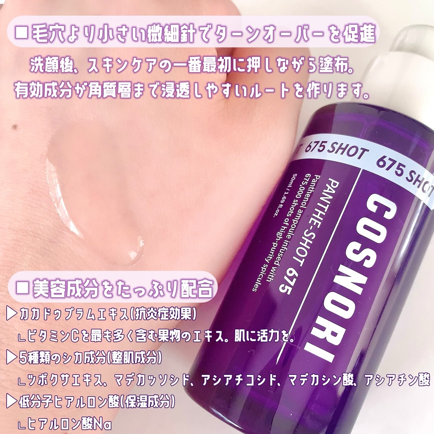 肌の組織と最も類似している成分サーモンPDRN 5,000ppm配合しており弾力ケアができるだけでなく、保湿&肌バリア保護に優れたパンテノール成分50,000ppmが配合。 保湿&肌バリア保護に優れたパンテノール100,000ppm配合。さらにナイアシンアミド・アデノシン配合で美白&弾力ケアまで同時に。 PDRNショット675はとろみがあるもののなじみが良くモチッとうるおい感のある肌に。