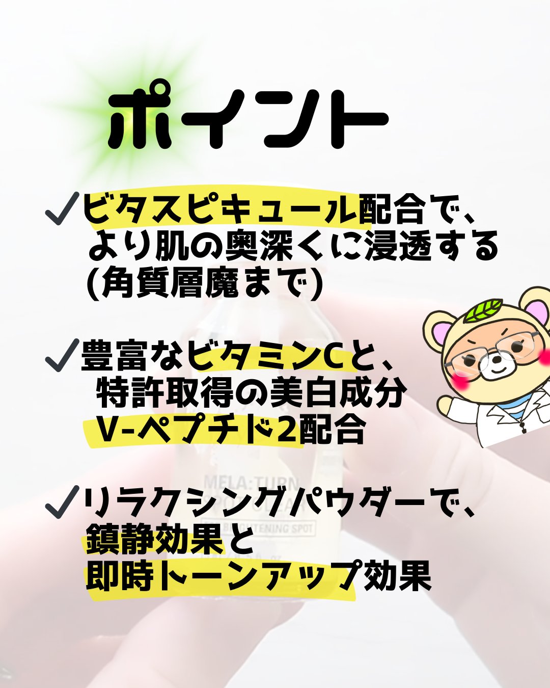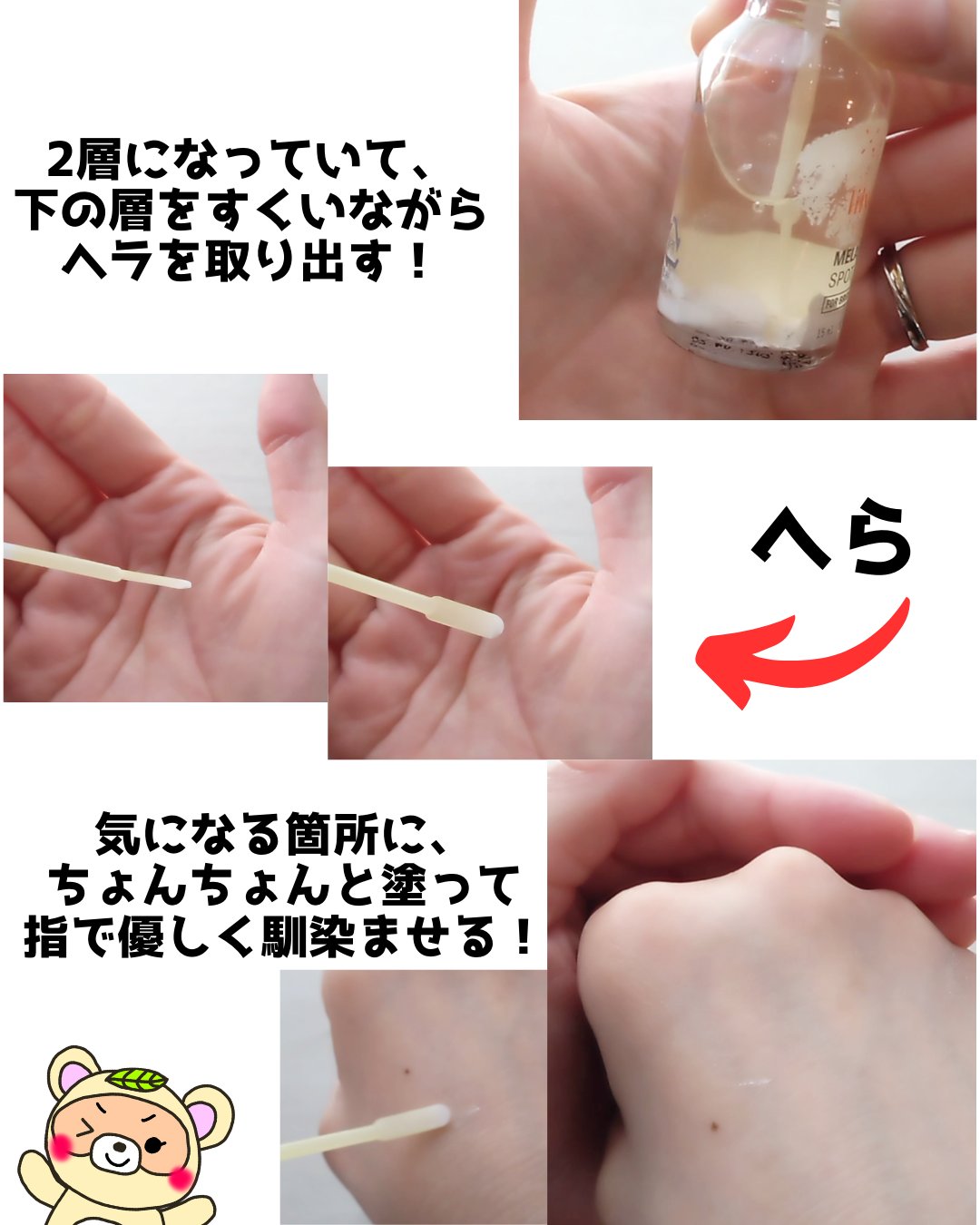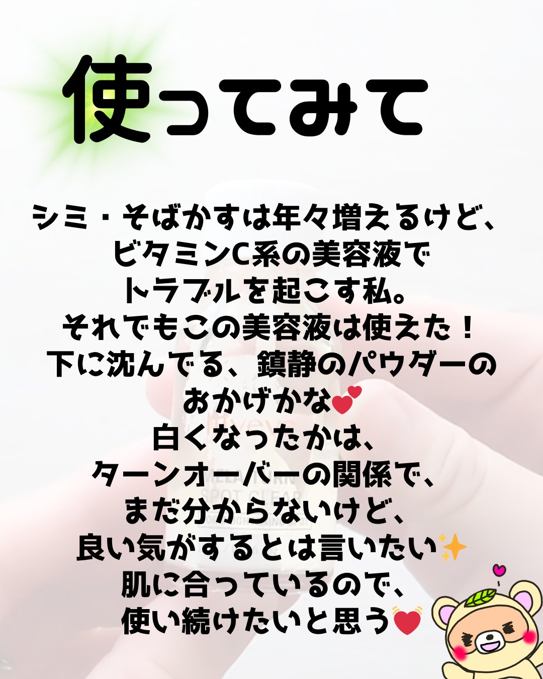 ✴︎lilyeveMELA:TURNSPOTCLEARリリーイブのシミにアプローチしてくれるMELA:TURNSPOTCLEARを使用させていただきました。これは二層式になっていて、ビタスピキュールとリラクシングパウダーが入っています。底の白...