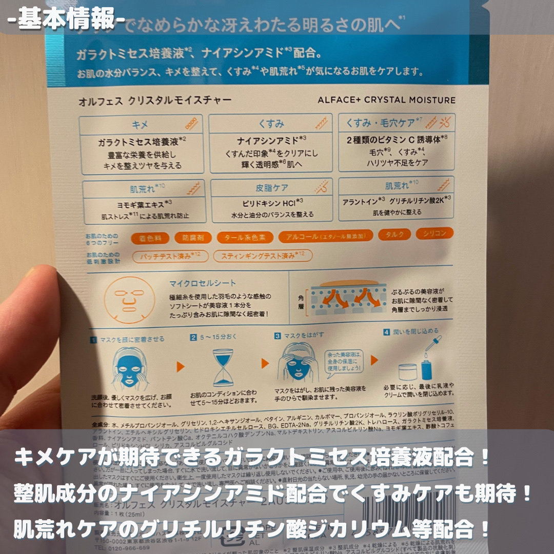 なんだこれ、めっちゃ気持ちいい〜!!ALFACE+のクリスタルモイスチャーマスク。液がヒタヒタに入ってるわけでも無いんだけどマスクの生地が液をすごい含んでくれてる…!から、液余りがない。すっきり。そしてなんかふわっとしたジェルみたい…!こんな...