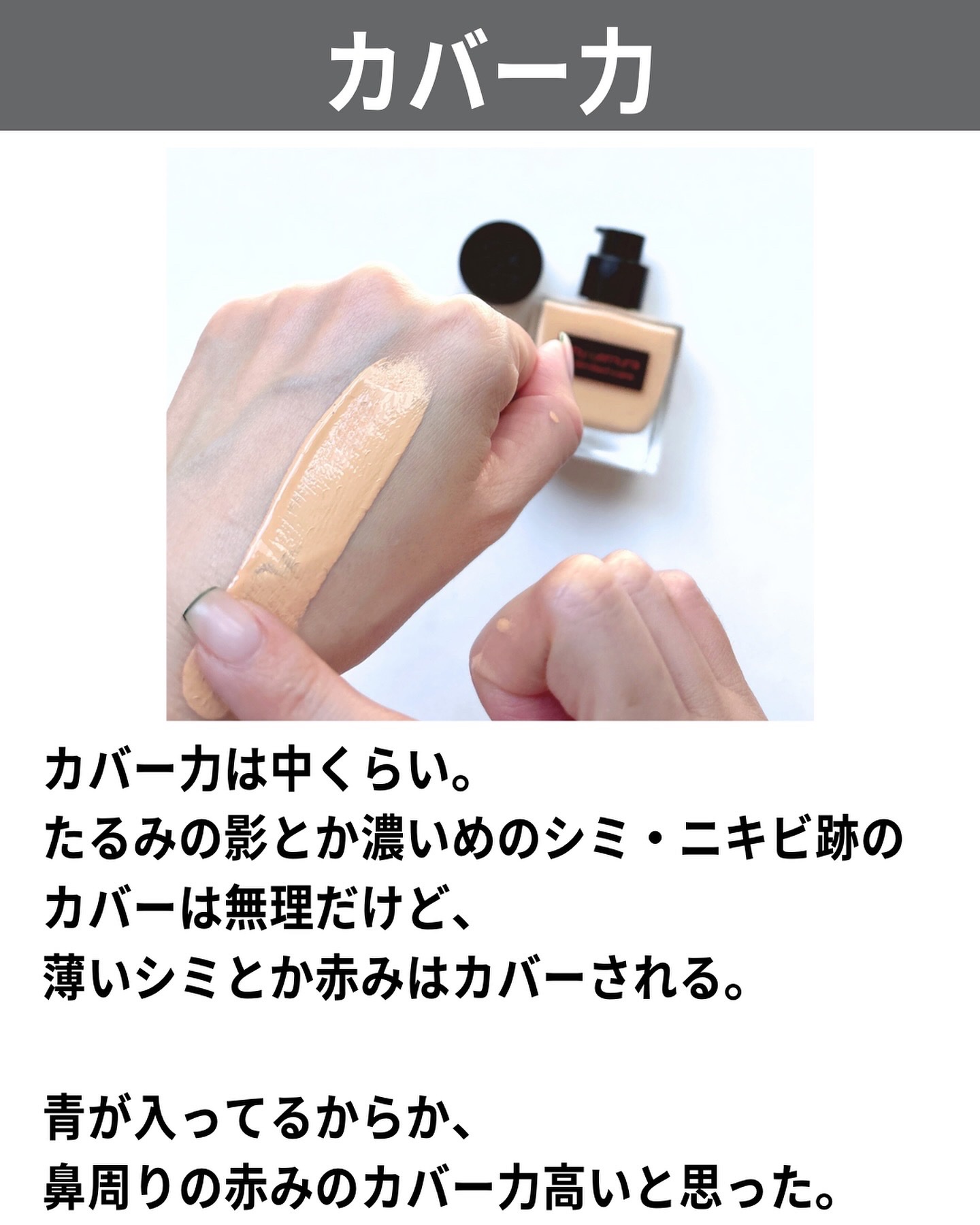 リニューアルして変わったところは パケがガラスに 5,390円に値上げ 香りが付いた 液が逆流しなくなった カバー力UP 24時間耐久に 私はいつも標準色よりひとつ暗めを使ってて、全顔は2Nで目の下の青クマがある日は1CR、明るくしたいときは1Nか1.5N使ってるよ。 ブログでは、 バックステージのコンシーラーとの色比較、フォーエバーのファンデとの色比較、他ブランドのファンデの色比較もしてるから参考にしてみてね!