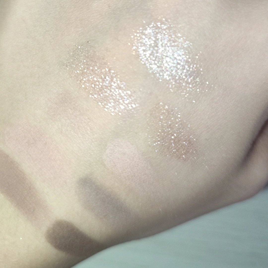 フラワーノーズのパケは本当にゴージャスでステキ ごつくて収納に優しくないけどここまで振り切ってればもう仕方ない 粉質はふわさら系 発色もひかえめ 彩度抑えたパレット ミュートメイク向けですかね🤔 その分ラメがもうギラッギラ でも下品なギラギラじゃないのがうまく作ってるよね✨