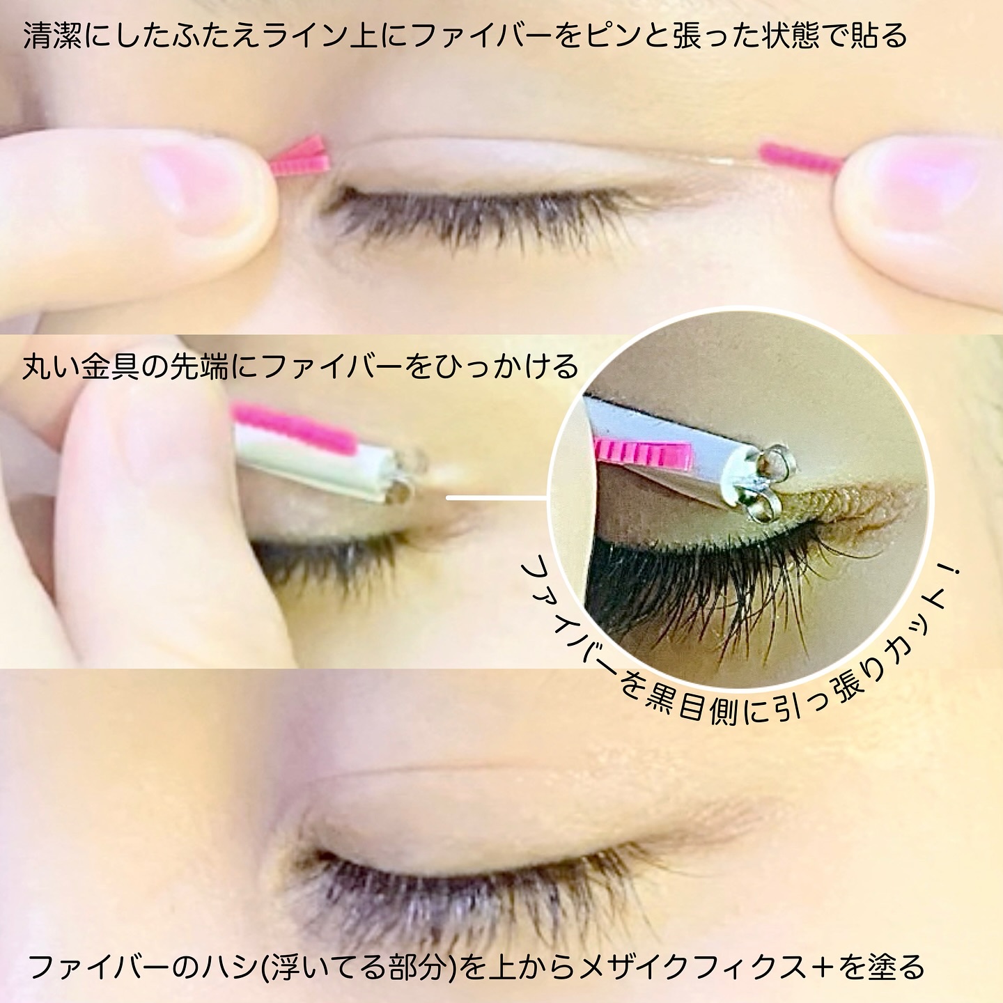 医療用として開発された伸縮性のある極細粘着ファイバーがまぶたにくい込み、立体的なふたえを形成してくれる🙆♀️✨ 目を閉じてもひきつれず、アップ画像にも耐えられる自然な二重はプールも入れる超ウォータープルーフで、運動時にも安心🫨💓 フィクスプラスがあることでより密着感が増す✨ あとクリップカッターが超便利◎