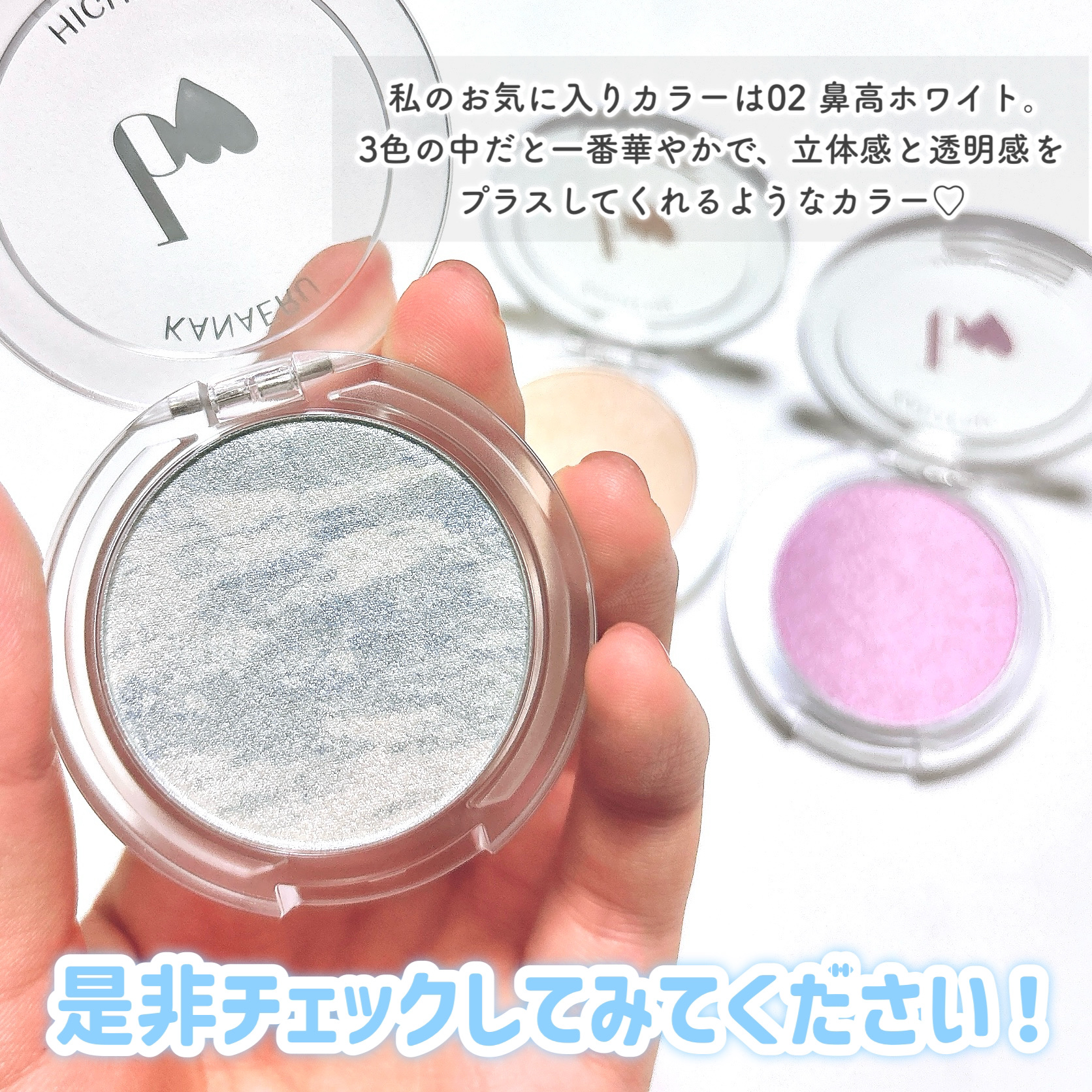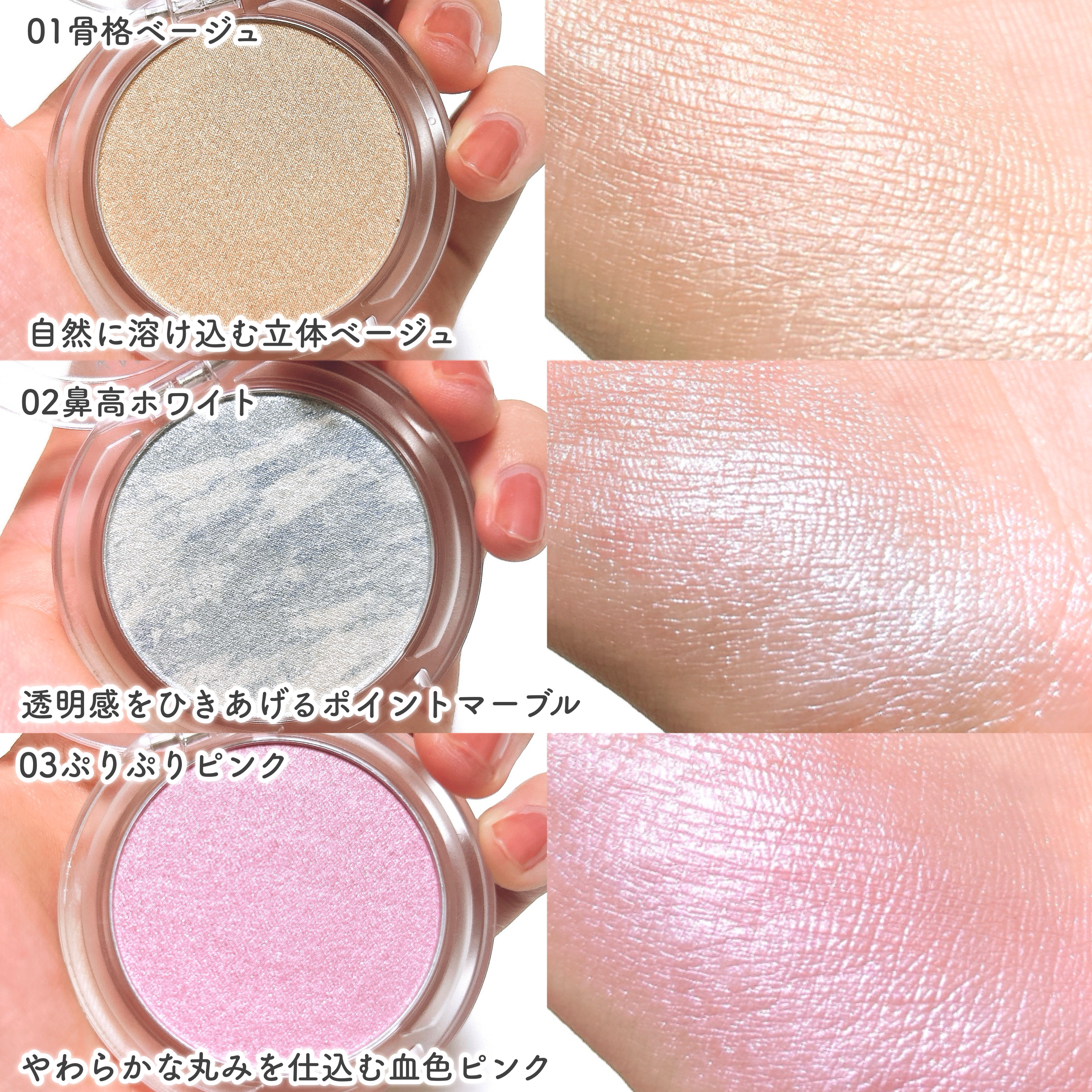 - b idolから新定番! 私にかける、魔法の光。 叶えるハイライト \立体感*血色*透明感/ 欲しいところにプラスする、シルキータッチなハイライト 骨格ベージュで顔全体をフラットになじませて、 鼻高ホワイトで鼻筋や額、高く見せたい所にポイント使い♪ ぷりぷりピンクはチーク使いでかわいく仕込む♡ お肌のことを考えた美容成分*配合なので使いやすい◎ マルチに使える3色展開!コンパクトなのでもち運びにもとっても便利。 *ティーツリー葉油、ヒアルロン酸Na、セラミドNP(全て保湿成分) <01 骨格ベージュ> 自然に溶け込む立体ベージュ <02 鼻高ホワイト> 透明感をひきあげるポイントマーブル <03 ぷりぷりピンク> やわらかな丸みを仕込む血色ピンク ※全てメイクアップ効果
