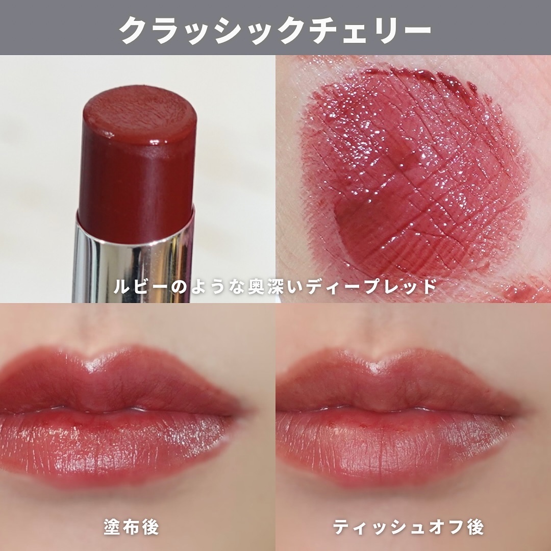 今回のシリーズは、透け感があって唇馴染み度120%🫦 ぐりぐり塗っても画像の通り! これがまた今っぽくて使いやすい。 全シリーズ同様に安定の塗り心地の良さ。 色付きリップクリームに 落ちにくさのお墨付きがついた感覚🤗 ガツンと発色する感じでもないので、 落ちていく工程もナチュラルだし 血色は悪くならない程度の色持ちを キープできる安心感は結構大きい👏