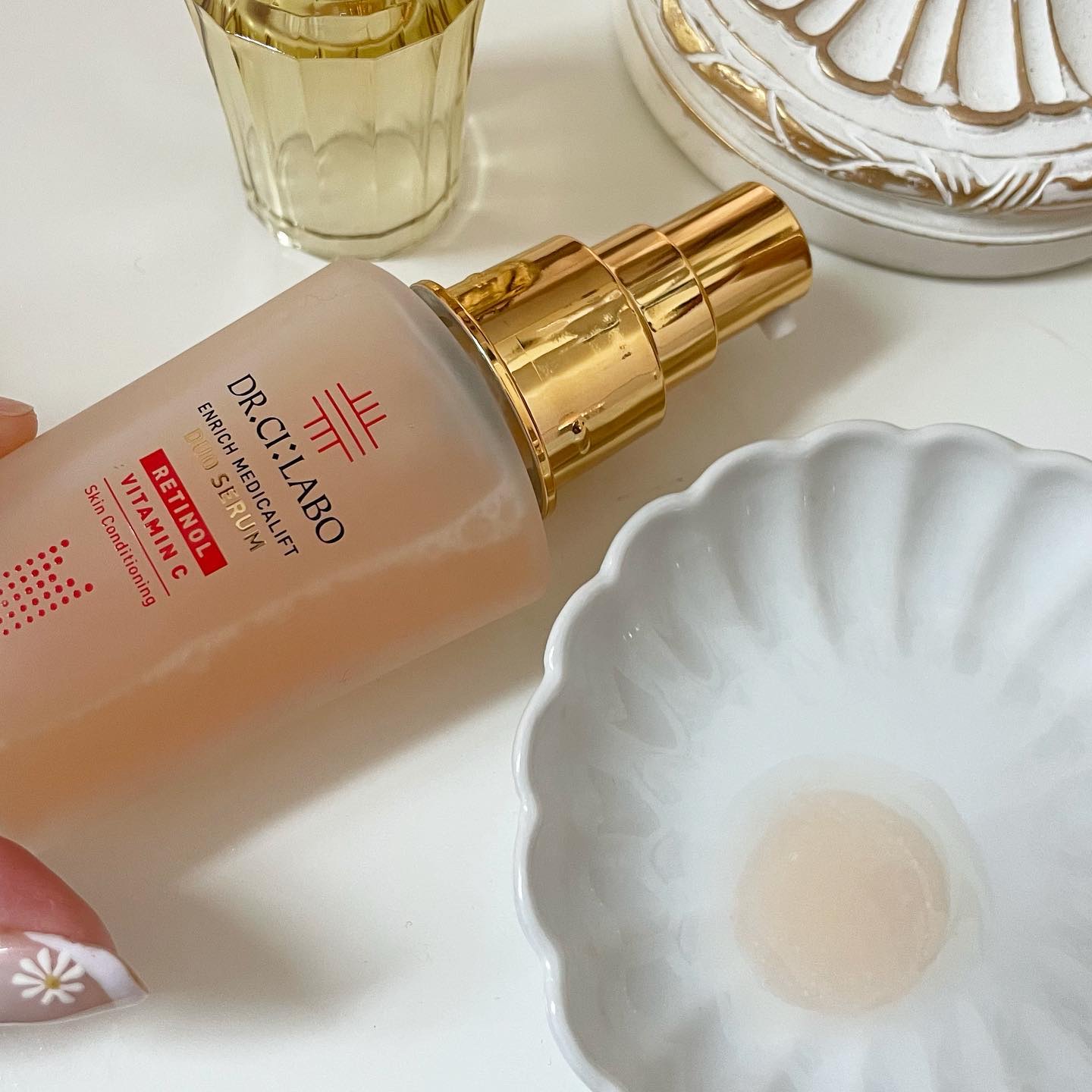 純粋レチノールとビタミンCが配合されている美容液🍋 ハリ、うるおい、毛穴のケアが同時にできるだって。セラムは2層になっていて、使う直前に混ぜて使います。 柑橘系の香りが爽やかで良い感じ🍊