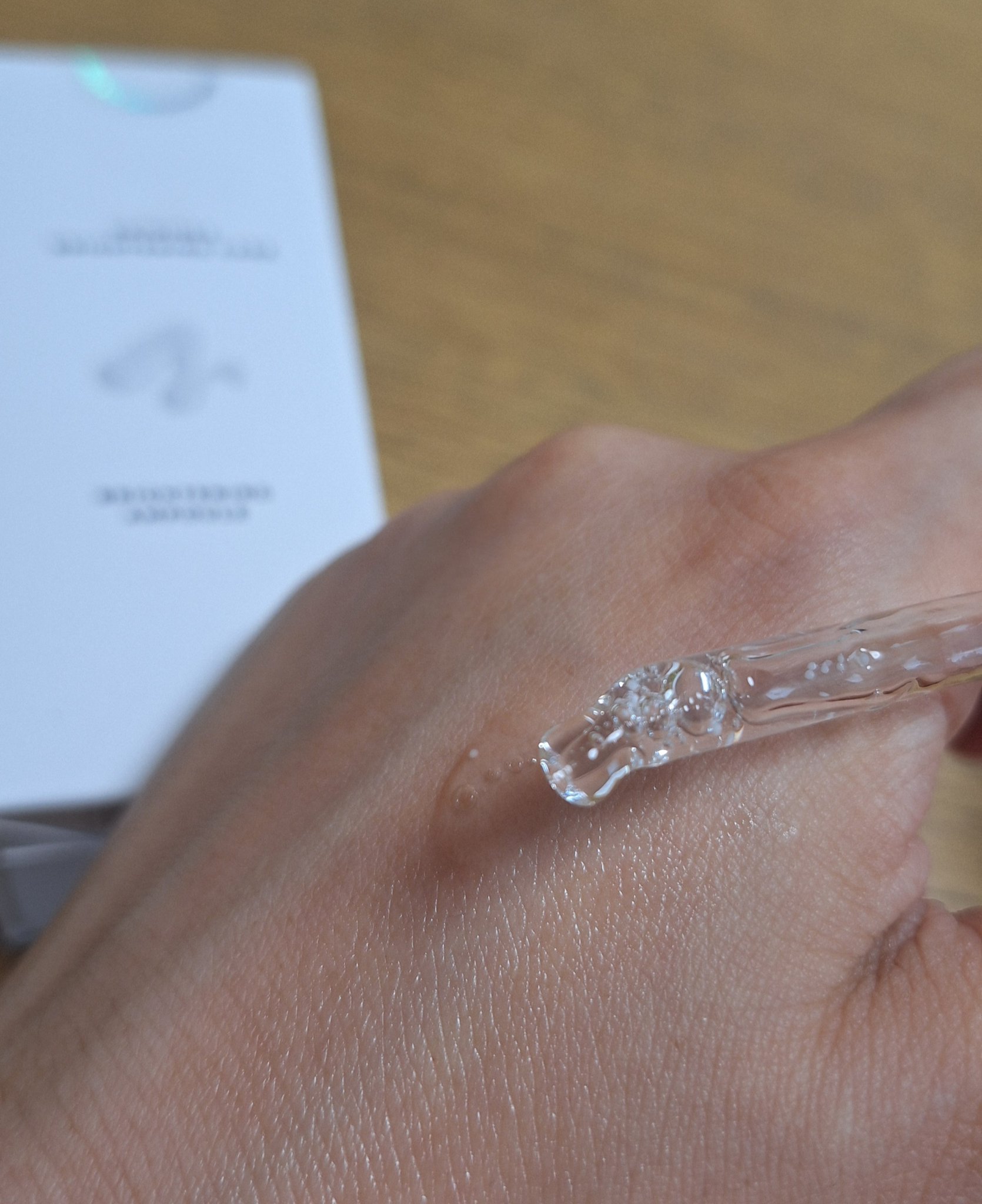 スポイトで取り出すタイプの美容液です。出しすぎ防止にもなるのがとても良いです。 透明の液体に白い粒が入っていて程よいとろみがあり、スーッと肌に浸透しました。 首のシワやほうれい線のあたりがモッチリとして艶もでたような気がします。