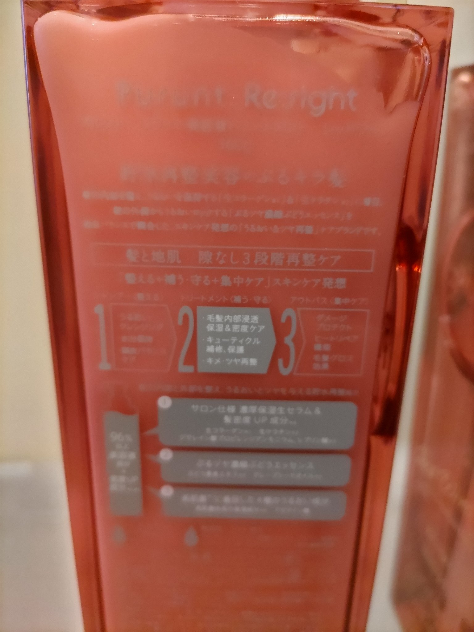芳醇なレッドワインと甘酸っぱいフルーツを合わせた、華やかで上品な香りがすごくいいです☺️ 美容室メーカーが366日かけて開発した、貯水再整美容のぷるキラ髪✨ 髪の内部を整え、うるおいを保持する「生コラーゲン」と「生ケラチン」に着目しており、髪の外側からうるおいロックする「ぷるツヤ濃縮ぶどうエッセンス」を独自バランスで調合しております。 とにかく香りがすごくいいです!! 渋いワインの香りというよりは甘くフルーティーな感じが強めだなと感じました。