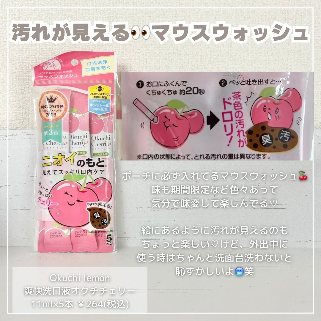 選べる福袋で、お店にあった全種類のオクチシリーズを購入🛒 1袋分264円×5袋1320円が1050円❣️ サンプルも付けてくれました 口の中の汚れ、磨き残しを除去し、口臭の原因の一つであるタンパク質を固めて洗い流す口内洗浄液です。 キュンと甘酸っぱいチェリー🍒 ノンアルコール・低刺激