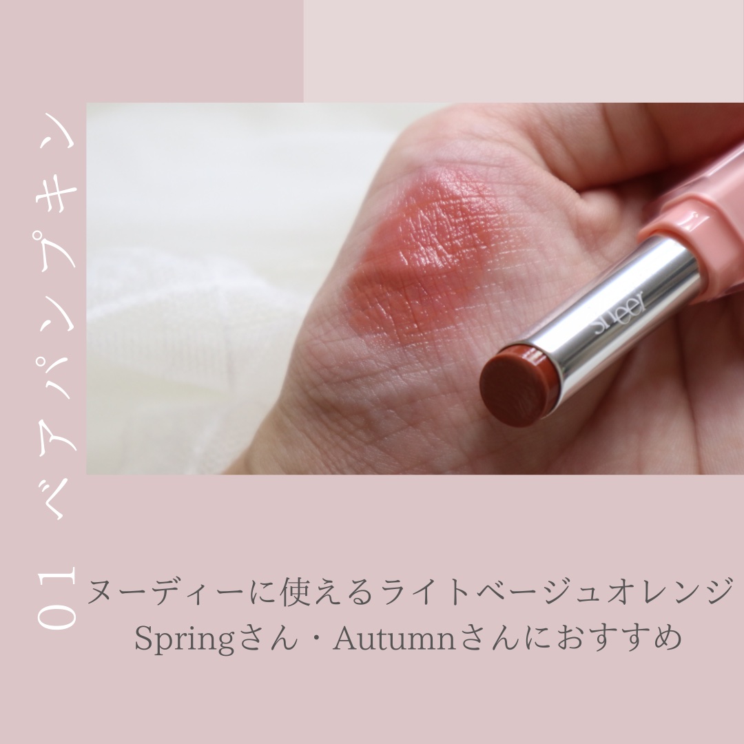 保湿力が高いむちむちリップ🎀 キャラメルのようにとろけるもちつや質感✧ 保湿力が抜群◎ 01 モーブローズ(パールあり) 02 メリーコーラル 03 サンドモンド(パールあり) 04 フィグピーチ 05 スコッチショット 06 ハニーナッツ 07 カシスプラム 08 サマーパンプキン(パールあり) 09 サーモンシロップ(パールあり)