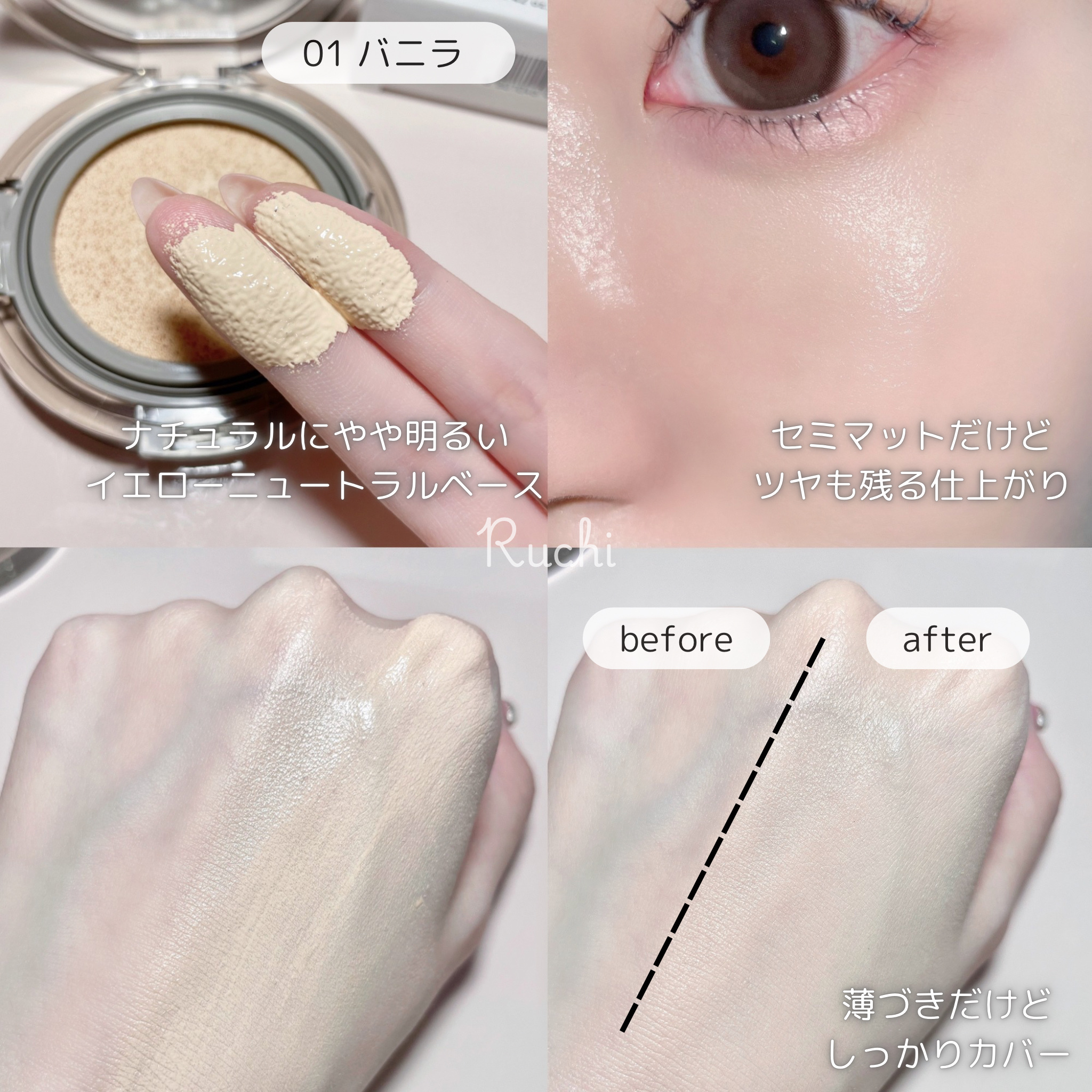 薄づきなのに肌の欠点を完璧カバー! ブラー加工したようにキメ細かくなめらかで、毛穴の目立たない、つるり肌へと導くブラーカバークッションファンデ✨ 軽い付け心地で厚塗り感なく 気になる箇所をナチュラルにカバーしてくれてセミマット仕上がり☺️ 重ね塗りしてもダマになりにくく、毛穴落ちしにくいのも嬉しい🤍
