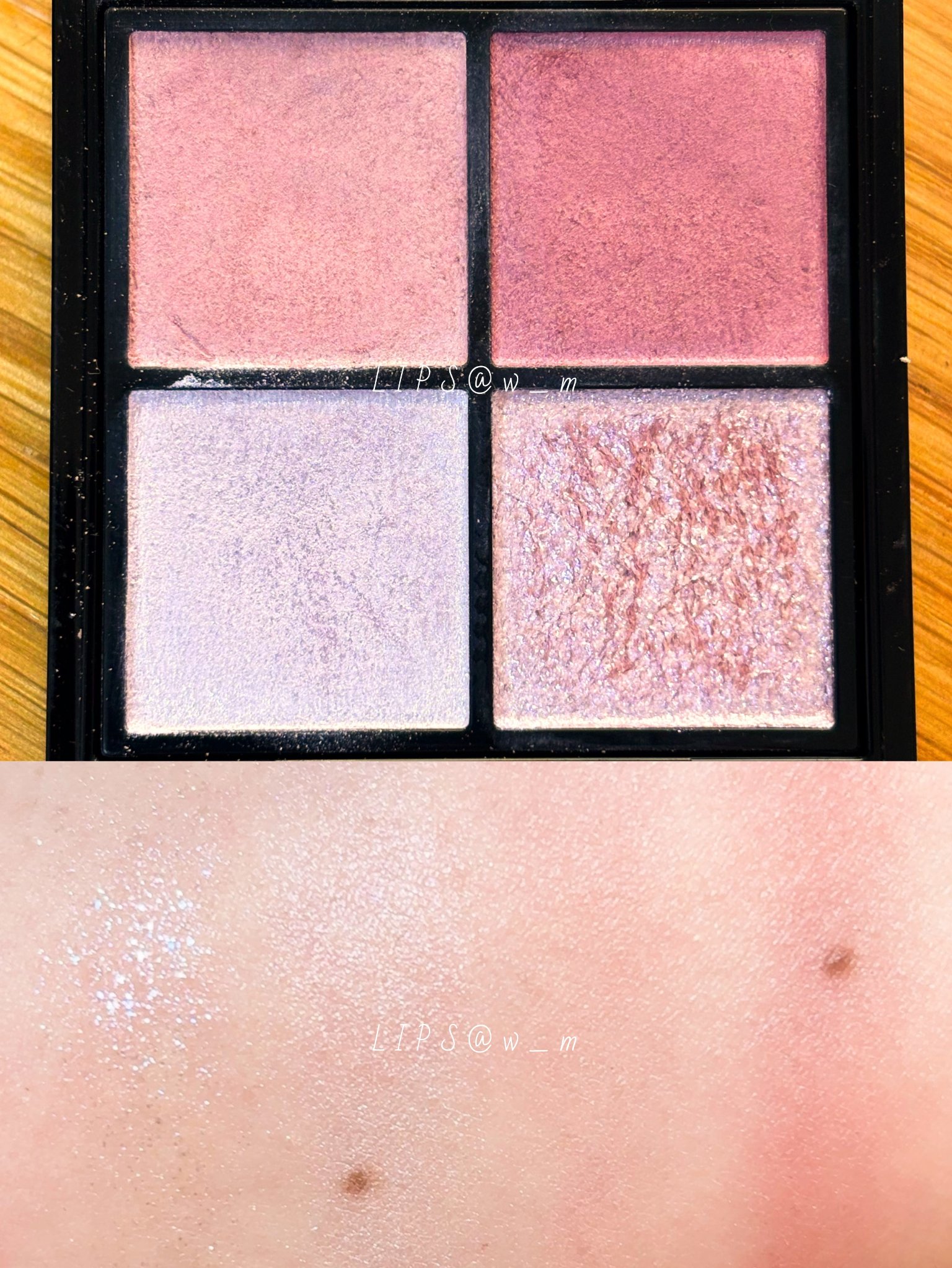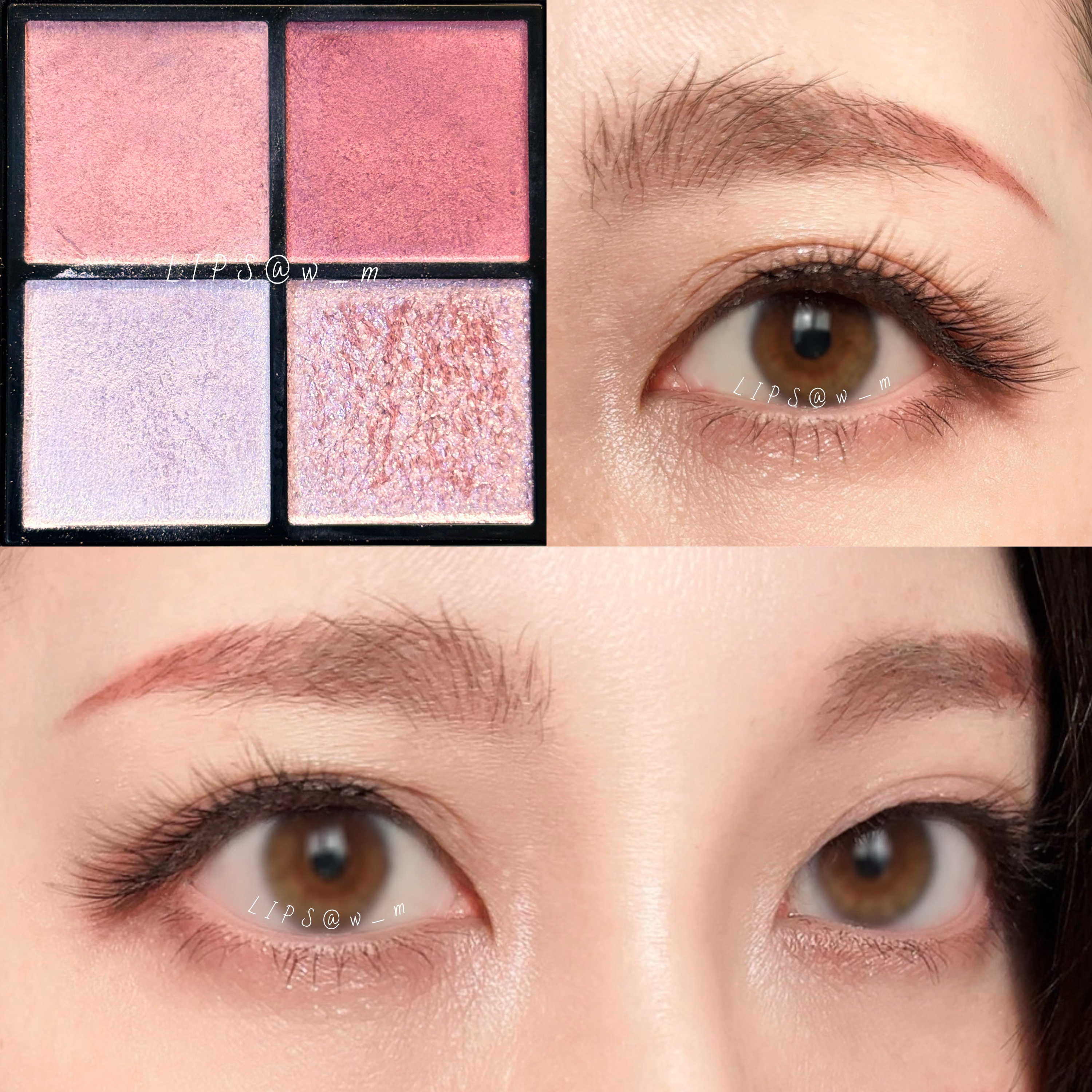 全体的に見た目より柔らかいシアー感のある発色 メインカラー+ラメ/メインカラー+締め色/上段左右→下段右/上段左→下段左右と好きなように使える配色なのも◎ 左上はかなりはっきりしたラメカラー 公式ではアイホール全体に入れるよう推奨してたけど、流石に派手過ぎたので今回は割愛しました しっとりテクスチャだけど細いブラシだとボソボソとまとまって取れるので、小指でささっと塗るのが粉飛びせず1番安心して使えるかも