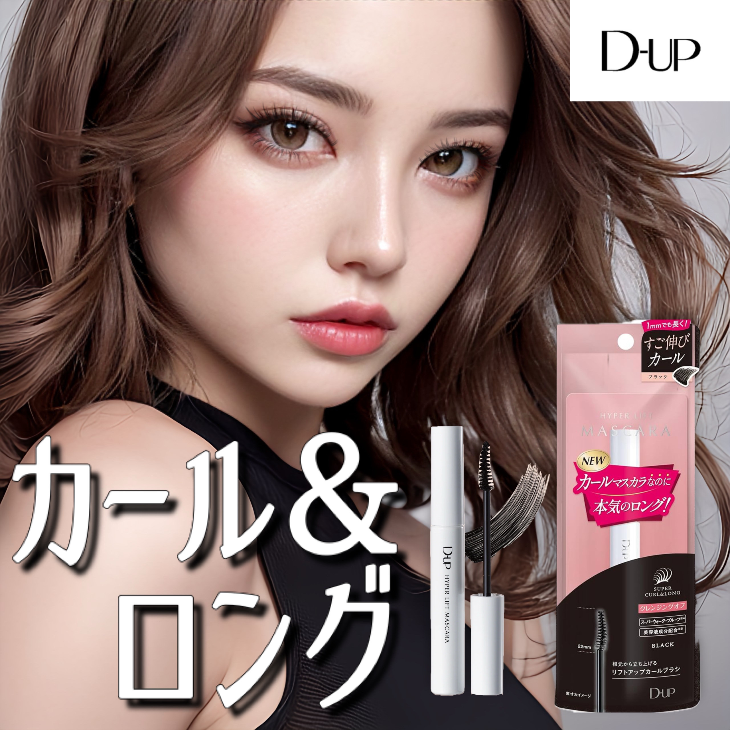 - 2024年10月1日より全国のバラエティショップ、ドラッグストア、公式オンラインショップ(https://store.d-up.co.jp/)にて発売いたします。 『ハイパーリフトマスカラ』は、“カールマスカラで本気のロング”をコンセプトに、ディーアップ史上最強のカールキープ力と驚きの長さを追求した新しいマスカラです。 ■カールキープ力とロング感の両立 カールキープ力の高いマスカラは、通常ワックスや被膜材でカールをキープしますが、同時に「ロング感」や「ダマの無い仕上がり」を両立させることは難しいとされてきました。ハイパーリフトマスカラは、あと1㎜長く、もっとなめらかにするための改良を重ね、「カールキープ力」と「ロング」どちらも限界レベルまで欲張った新処方です。 ■1㎜でも長く!「すご伸びカール」 ロングの秘密は、なめらかで“伸び感”のあるカール液。ファイバーを包み込みながら素早く毛先まで絡み、美しくスッと長いまつげを実現します。 さらに長さを出すため「まつげの根元」にも着目し、生え際から持ち上げて伸ばす、コンパクトなリフトアップカールブラシを新たに採用しました。 『ハイパーリフトマスカラ』で、想像を超える“新次元の上向きまつげ”を体験してください。