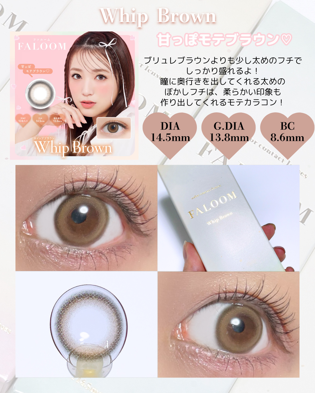 - ※2025年6月以降、商品パッケージ裏面・側面の一部表記を順次変更いたします。尚、これにかかる商品の交換・返品は承っておりません。 『わたしにハマる♡盛れ発色ブラウン』4色のカラーラインナップ ■ヒミツのちゅるんブラウン Secret Tutu Brown (シークレットチュチュブラウン) DIA:14.2mm 着色直径:11.2mm ニュアンスブラウンカラーが自然に瞳のトーンアップを演出してくれる裸眼風デート系レンズ。 ■はかなげ大人っぽブラウン Brulee Brown(ブリュレブラウン) DIA:14.5mm 着色直径:13.8mm トレンドの白っぽブラウン×ふわっとフチデザインで、大人っぽい瞳を演出。 ■甘っぽモテブラウン Whip Brown(ホイップブラウン) DIA:14.5mm 着色直径:13.8mm まろやかベージュブラウン×ぼかしフチデザインで、明るく優し気な瞳を演出。 ■あざとよくばりブラウン Smore Ring Brown(スモアリングブラウン) DIA:14.5mm 着色直径:13.8mm こなれアッシュブラウン×くっきり太フチデザインで、きゅるっと可愛らしい瞳を演出。 カラーコンタクトレンズの不適正使用による眼障害の危険性等などがあります。 ●コンタクトレンズは高度管理医療機器です。不十分な洗浄・消毒など不適切なケアや、長時間・交換期間を超えた装用により、アレルギー性結膜炎、角膜感染症、角膜潰瘍等の重篤な眼障害が発生する危険性があります ●ご使用前に取扱説明書を確認してください 使用上の留意事項 ●眼科医院等を受診してからお求めください ●眼に異常を感じたら直ちにレンズ使用を中止し、お近くの眼科等で診察を受けてください ●医師の指示にしたがってご使用ください ●コンタクトレンズを装用する場合、自覚症状がなくても、眼科医院等での定期検査を受けてください ●レンズに不具合がある場合は使用しないでください