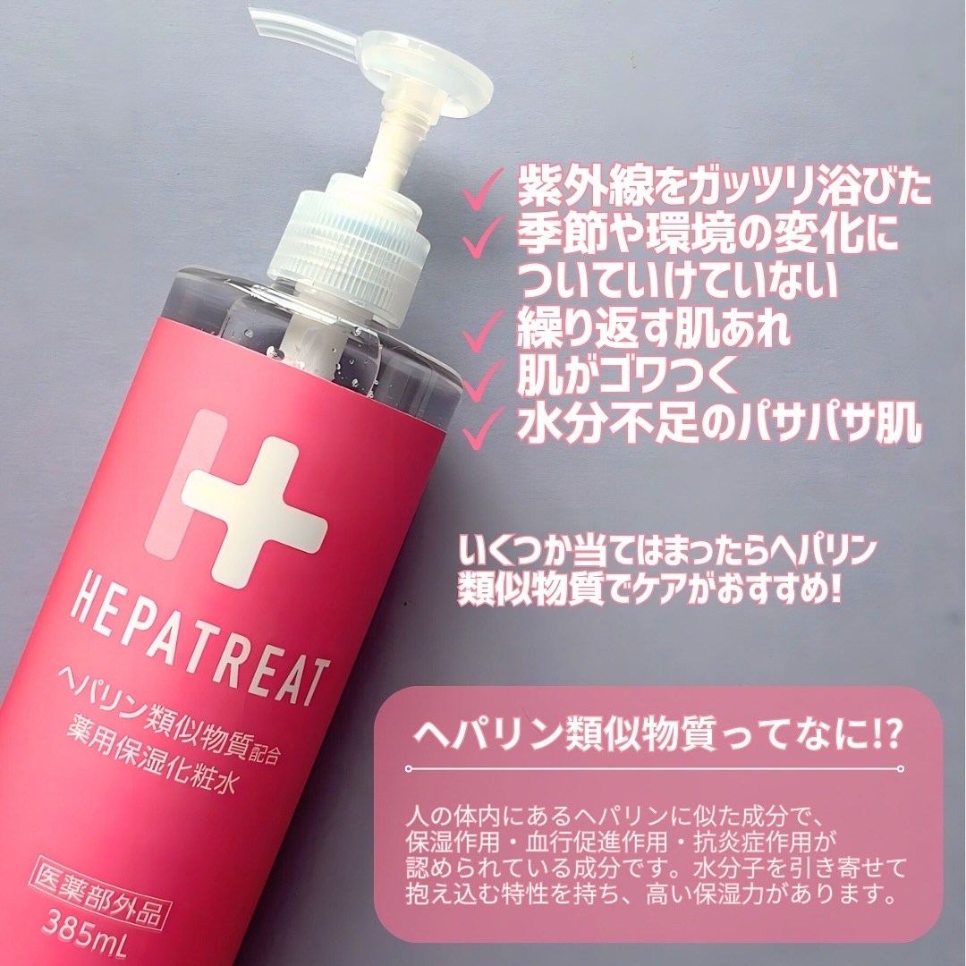 - ヘパトリートは保水有効成分のヘパリン類似物質と肌あれ有効成分のグリチルリチン酸ジカリウムを配合し、8つのフリーを実現。低刺激処方ながら高機能な化粧水です。さらに、薬用化粧水では珍しい大容量ポンプ(385mL)でとても使いやすく、赤ちゃんから大人まで、顔や全身の肌あれ・乾燥に使えます。 ■Wの有効成分 1.ヘパリン類似物質 顔・全身の乾燥を防ぐ 肌の乾燥による肌あれ/あれ性/皮膚を健やかに保つ/肌を整える/あせも/ひび/あかぎれ 2.グリチルリチン酸ジカリウム ニキビを防ぐ/肌をひきしめる/日やけ、雪やけ後のほてりを防ぐ/しもやけ/かみそりまけを防ぐ ■肌にやさしい低刺激処方<8つのフリー> 無香料/無着色/無鉱物油/無動物油/パラベンフリー/アルコールフリー/石油系界面活性剤フリー/シリコンフリー ※パッチテスト済み ※スティンギングテスト済み