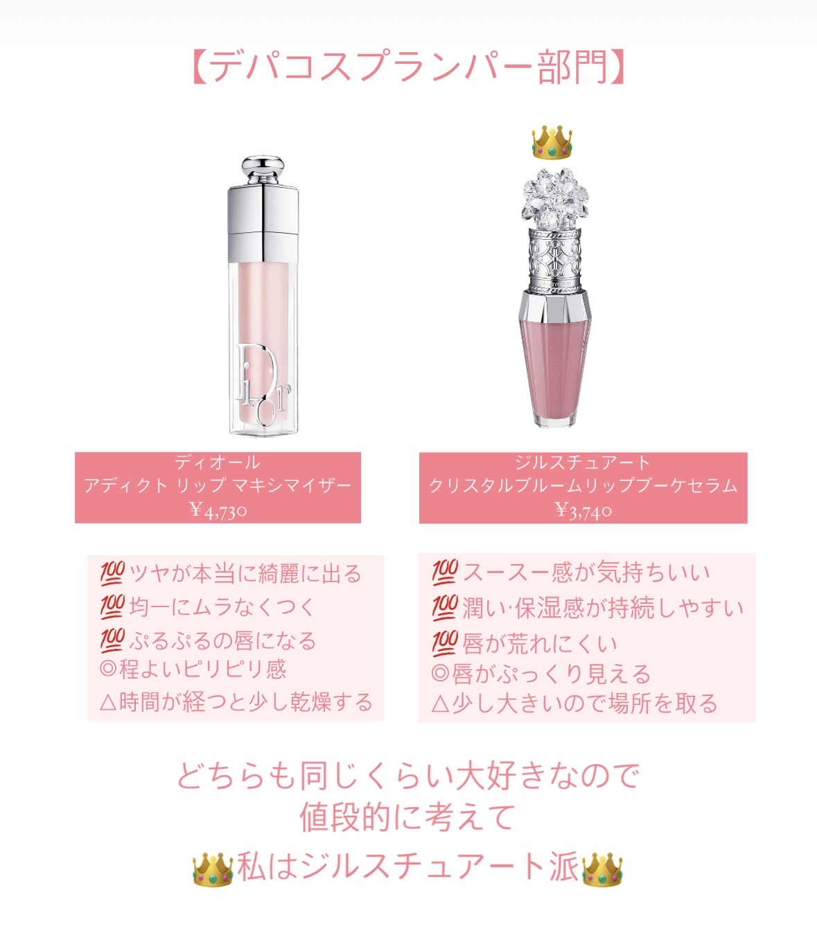 マキシマイザーの1番の魅力は、塗るだけで唇をむっちりぷっくりにしてくれます。 リップ下地としても使用できますが、マキシマイザーの上にリップを塗ると多少むっちりした質感に近くなります。 ヴィセの方が若干刺激感が弱いかな?と思いました。 リップ下地としても使いやすいし、リップの上から重ねても綺麗に塗れるところです! このプランパーは、私が今まで使ってきたものの中でもプランプ効果が結構高かったです。 結構スースーするので、唇の荒れやすい私には合わないかも、と思いましたが荒れずに使うことができました! このグロスの魅力は、唇に塗ると本当にガラス玉のようにちゅるっちゅるの唇に見せてくれます。