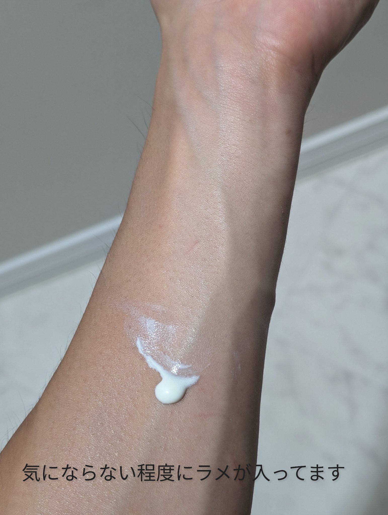 - <105g> 水、メトキシケイヒ酸エチルヘキシル、エタノール、BG、パルミチン酸イソプロピル、酸化チタン、ビスエチルヘキシルオキシフェノールメトキシフェニルトリアジン、エチルヘキシルトリアゾン、ジメチコン、(メタクリル酸ラウリル/メタクリル酸Na)クロスポリマー、水添ポリイソブテン、ジエチルアミノヒドロキシベンゾイル安息香酸ヘキシル、シリカ、含水シリカ、マイカ、パルミチン酸デキストリン、トリポリヒドロキシステアリン酸ジペンタエリスリチル、(アクリレーツ/アクリル酸アルキル(C10-30))クロスポリマー、トリエトキシカプリリルシラン、セタノール、ステアリン酸グリセリル、ヒドロキシエチルセルロース、ポリソルベート60、ポリシリコーン-9、水酸化Al、水酸化K、ローヤルゼリーエキス、ヒアルロン酸Na、酸化スズ、フェノキシエタノール、メチルパラベン、EDTA-2Na、BHT、香料