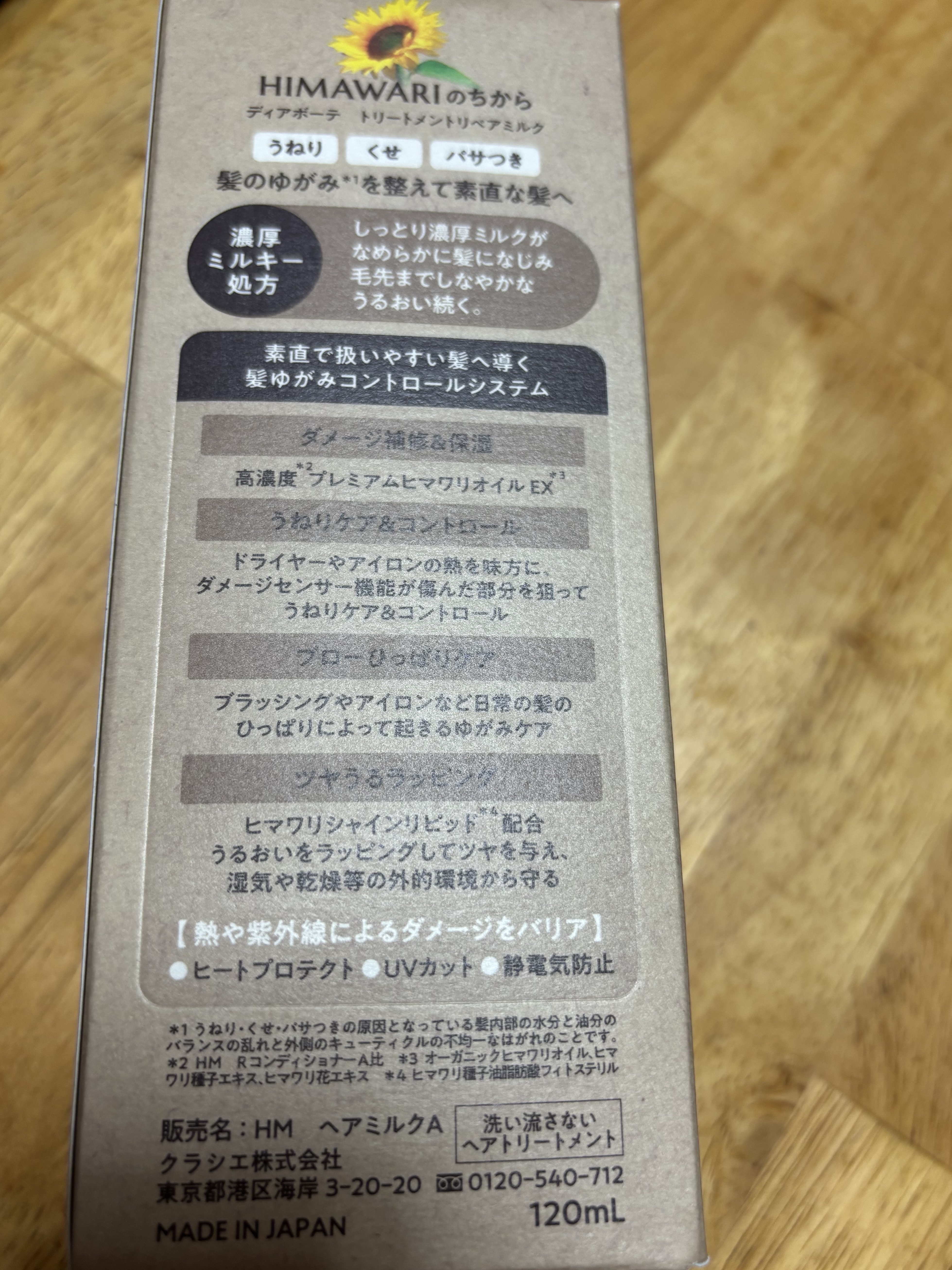 - ※2024年9月30日、リニューアル。 ●髪のゆがみ*1をケアして、素直な髪へ導くヘアケアブランド ●毛先までしなやかなうるおい続くミルクタイプの洗い流さないトリートメント ●濃厚ミルキー処方 ●素直で扱いやすい髪へ導くゆがみ*1ケアシステム ●ダメージ補修&保湿成分「高濃度*2プレミアムヒマワリオイルEX*3」配合 ●熱を味方に毛髪と結合し、髪の外側をコート ●浸透サポート成分(セバシン酸ジエチル)配合で、成分を髪内部に素早く浸透 ●ブローひっぱりケア ●「ヒマワリシャインリピッド*4」を配合した「ツヤうるラッピング」 ●ヒートプロテクト ●UVカット ●静電気防止 ●陽だまりのあたたかさと透き通ってさわやかなエレガントフローラルの香り *1:うねり・くせ・パサつきの原因となっている髪内部の水分と油分のバランスの乱れと外側のキューティクルの不均一なはがれのこと *2:HM RコンディショナーA比 *3:オーガニックヒマワリオイル、ヒマワリ種子エキス、ヒマワリ花エキス *4:ヒマワリ種子油脂肪酸フィトステリル(うるおい成分)