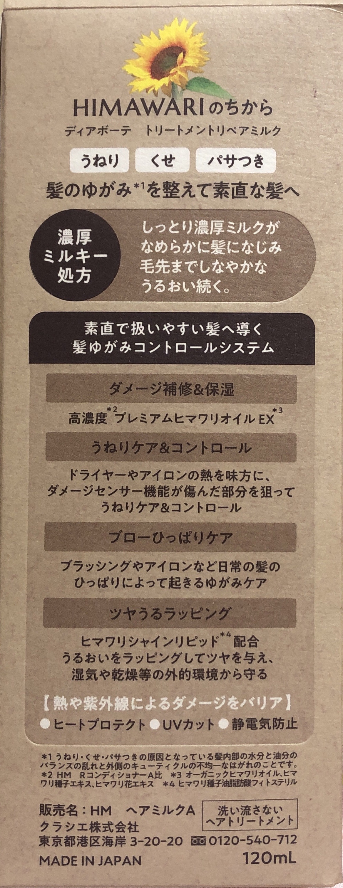 - ※2024年9月30日、リニューアル。 ●髪のゆがみ*1をケアして、素直な髪へ導くヘアケアブランド ●毛先までしなやかなうるおい続くミルクタイプの洗い流さないトリートメント ●濃厚ミルキー処方 ●素直で扱いやすい髪へ導くゆがみ*1ケアシステム ●ダメージ補修&保湿成分「高濃度*2プレミアムヒマワリオイルEX*3」配合 ●熱を味方に毛髪と結合し、髪の外側をコート ●浸透サポート成分(セバシン酸ジエチル)配合で、成分を髪内部に素早く浸透 ●ブローひっぱりケア ●「ヒマワリシャインリピッド*4」を配合した「ツヤうるラッピング」 ●ヒートプロテクト ●UVカット ●静電気防止 ●陽だまりのあたたかさと透き通ってさわやかなエレガントフローラルの香り *1:うねり・くせ・パサつきの原因となっている髪内部の水分と油分のバランスの乱れと外側のキューティクルの不均一なはがれのこと *2:HM RコンディショナーA比 *3:オーガニックヒマワリオイル、ヒマワリ種子エキス、ヒマワリ花エキス *4:ヒマワリ種子油脂肪酸フィトステリル(うるおい成分)