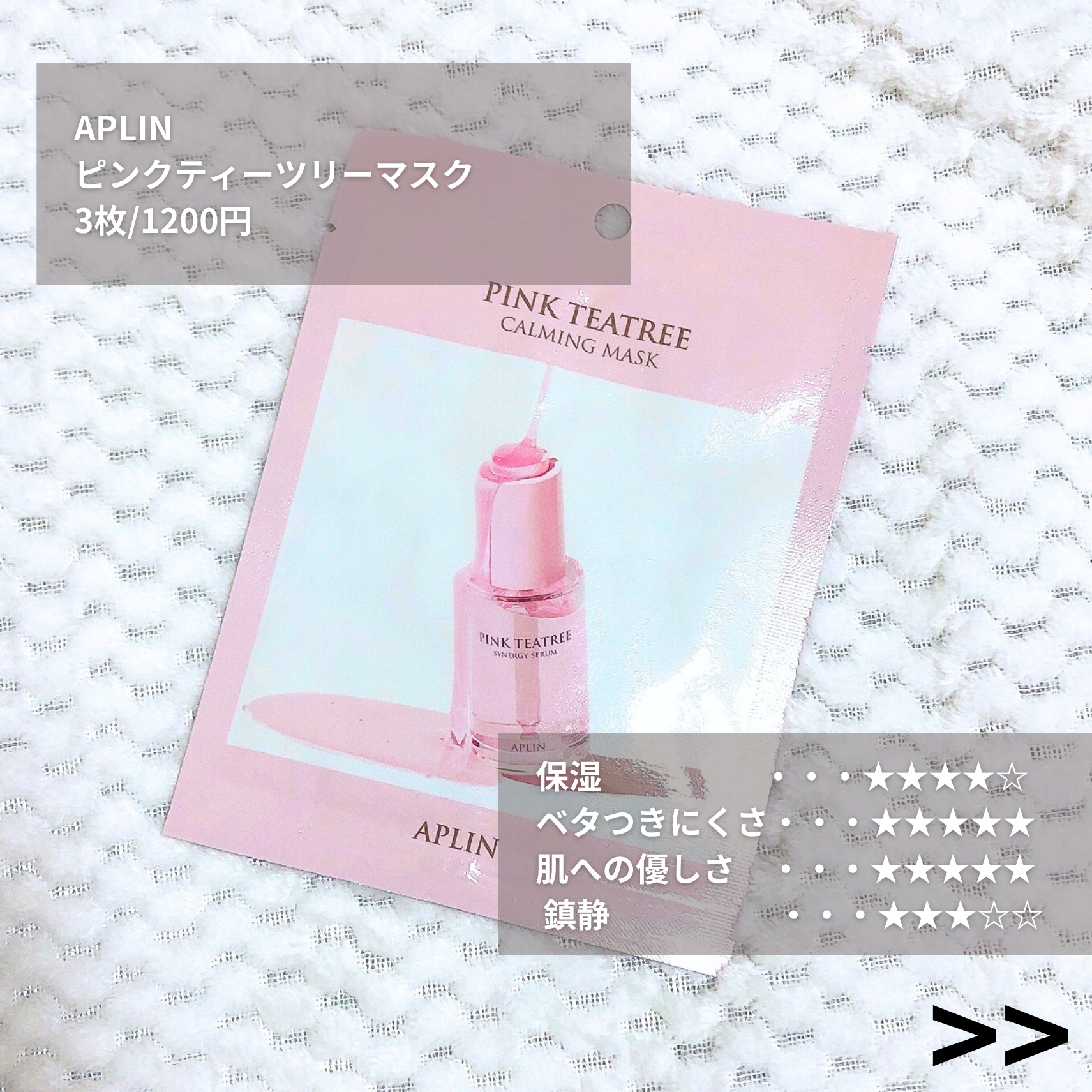 またまた肌も残暑を乗り切ろう!APLIN「ピンクティーツリーマスクパック」リプショにて1枚入り購入しました。ティーツリーとCICAで鎮静、ひきしめながらしっかり保湿。暑い時期には冷やして使うのがいいです。もちろん私は得意の冷蔵庫で冷やしました...