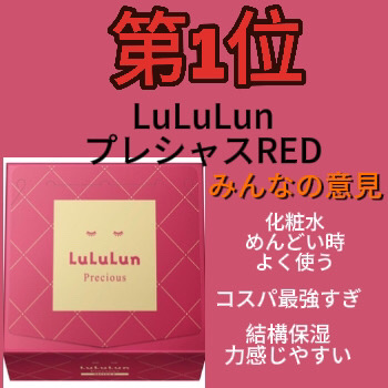 第5位 うるおいBOMB ・シートが厚めで液がヒタヒタだから使いやすい 第1位 LuLuLunプレシャスRED ・化粧水めんどい時よく使う ・コスパ最強すぎ ・結構保湿力感じやすい 第2位 ごめんね素肌 ・種類あるから迷ったらこれ ・使いやすくていい香り