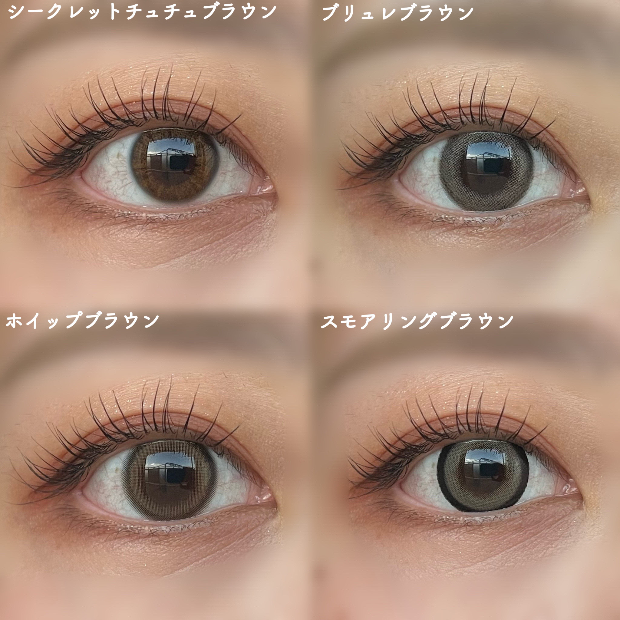 - ※2025年6月以降、商品パッケージ裏面・側面の一部表記を順次変更いたします。尚、これにかかる商品の交換・返品は承っておりません。 『わたしにハマる♡盛れ発色ブラウン』4色のカラーラインナップ ■ヒミツのちゅるんブラウン Secret Tutu Brown (シークレットチュチュブラウン) DIA:14.2mm 着色直径:11.2mm ニュアンスブラウンカラーが自然に瞳のトーンアップを演出してくれる裸眼風デート系レンズ。 ■はかなげ大人っぽブラウン Brulee Brown(ブリュレブラウン) DIA:14.5mm 着色直径:13.8mm トレンドの白っぽブラウン×ふわっとフチデザインで、大人っぽい瞳を演出。 ■甘っぽモテブラウン Whip Brown(ホイップブラウン) DIA:14.5mm 着色直径:13.8mm まろやかベージュブラウン×ぼかしフチデザインで、明るく優し気な瞳を演出。 ■あざとよくばりブラウン Smore Ring Brown(スモアリングブラウン) DIA:14.5mm 着色直径:13.8mm こなれアッシュブラウン×くっきり太フチデザインで、きゅるっと可愛らしい瞳を演出。 カラーコンタクトレンズの不適正使用による眼障害の危険性等などがあります。 ●コンタクトレンズは高度管理医療機器です。不十分な洗浄・消毒など不適切なケアや、長時間・交換期間を超えた装用により、アレルギー性結膜炎、角膜感染症、角膜潰瘍等の重篤な眼障害が発生する危険性があります ●ご使用前に取扱説明書を確認してください 使用上の留意事項 ●眼科医院等を受診してからお求めください ●眼に異常を感じたら直ちにレンズ使用を中止し、お近くの眼科等で診察を受けてください ●医師の指示にしたがってご使用ください ●コンタクトレンズを装用する場合、自覚症状がなくても、眼科医院等での定期検査を受けてください ●レンズに不具合がある場合は使用しないでください