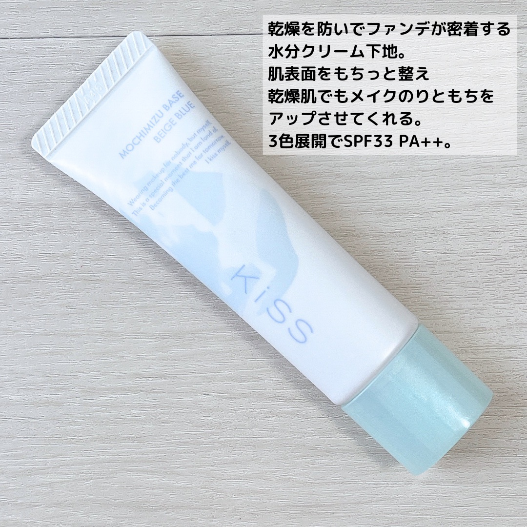- うるっ。もちっ。ぴとっ。 乾燥肌を整える、うるおい満タン下地 乾燥肌でもメイクのり&もちUP! ◇ベースメイクが吸い付くように肌に密着するキス独自の『もちみずテクスチャクリーム』。 クリームなのに、伸ばすとみずみずしくさっぱりとしたテクスチャ。 肌表面をもちっと整えて、乾燥肌でもメイクのりともちをアップさせます。 うるおいヴェールでフタをして、水分を逃さない ◇うるおいヴェールが水分の蒸散を防ぎ、うるおいをキープ。 メイクしたての心地よいもちっと感が続きます。 美容液成分86%配合! ◇ナイアシンアミド・バオバブエキス・ヒト型セラミド(うるおい成分)配合。 角層までうるおいで満たす美容液成分が、日中のお肌をサポートします。 薄膜でもしっかり毛穴・凹凸を補整 ニキビのもとになりにくい処方※1 ※1 ノンコメドジェニックテスト済。全ての方にコメド(ニキビのもと)が発生しないということではありません。 日常紫外線をカット SPF33 PA++ 2024年8月28日(水)ロフト先行発売 2024年10月1日(火)全国発売
