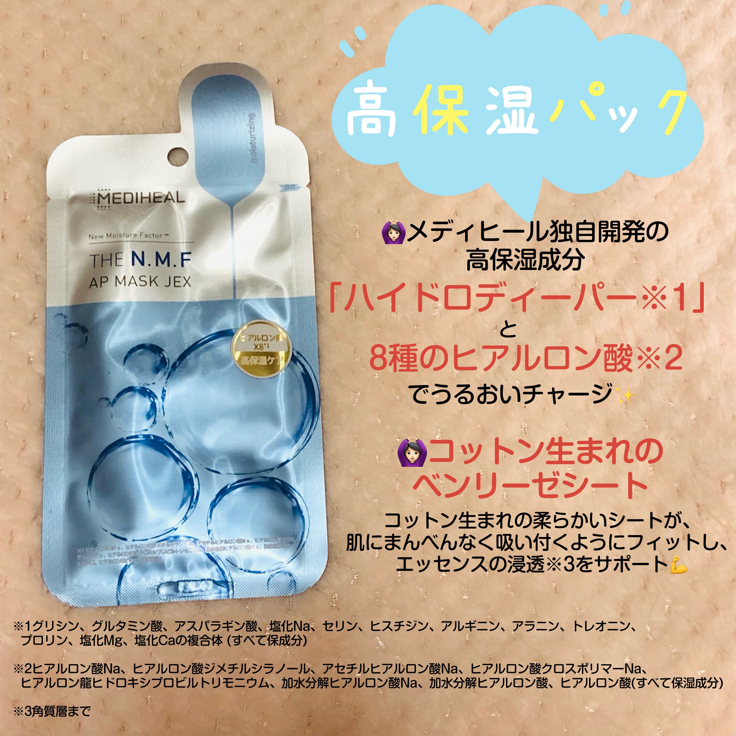 - 必須保湿因子を含む、メディヒール独自開発成分であるHYDRODEEPER™と8種のヒアルロン酸配合により、角質層のすみずみまでうるおいをチャージし、乾燥からお肌を守ります。高密着なシートでお顔の隅々までカバーし、潤いを与えます。