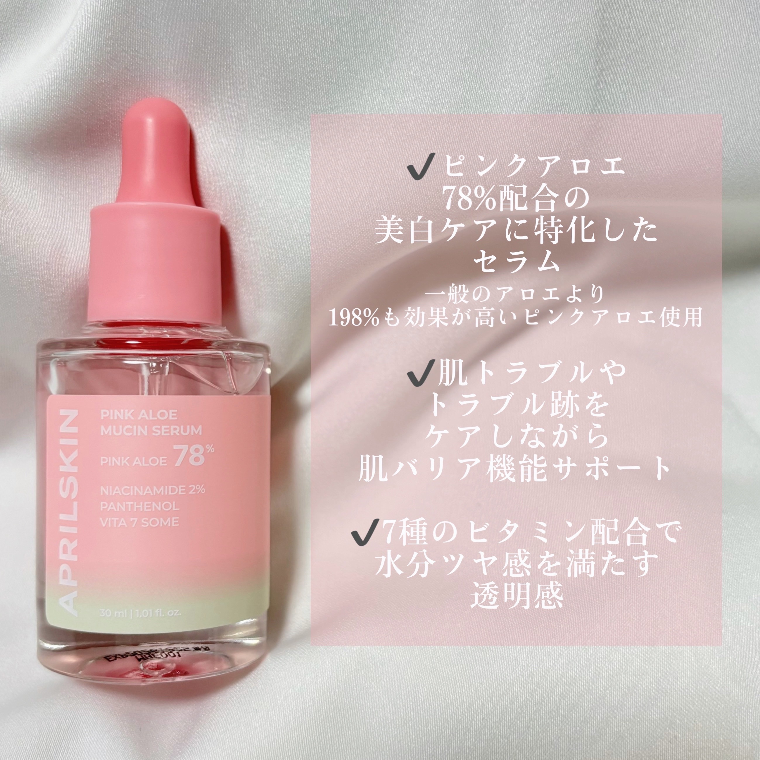ピンクアロエを78%そのまま閉じ込めた痕跡セラム。一般のアロエよりも198%も効果が高いピンクアロエを使用してます。 つけてみた感じは、もっちりしたテクスチャーで保湿感があります。かといってすーっと馴染んでベタつきはないです😊 頬の乾燥も気になるし、ニキビ跡も気になるからどちらにもアプローチしてくれるのは嬉しいです♥️