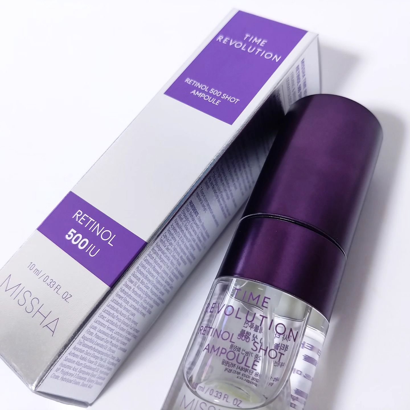 透明感あふれるうるおい肌へ💛 ミシャ タイムレボリューション レチ500ショット美容液 さらさらっとしてべたつき感のないテクスチャーで肌当たりも優しくスッと馴染みます✨ 刺激が少なくて毎日使用できるレチノールだと思いました👍🏻✨