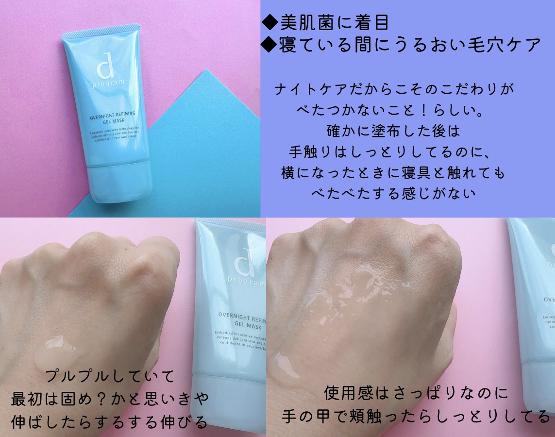 - 塗って寝ている間に集中アプローチ。 毛穴の目立たないつるんとなめらか美肌に導く薬用ナイトジェルマスク 誰の肌にも存在し、美しい肌の鍵である美肌菌に着目したd プログラム。 塗って寝ている間に集中アプローチ。 うるおって毛穴の目立たない「なめらか美肌」に導く薬用ナイトジェルマスク。 毛穴周りの肌にうるおいを与え続け、きめを整え毛穴の目立たない肌に導きます。 美容成分ブナエキスGL(ブナエキス、グリセリン/保湿)。 ●厳選成分配合、クリーン製法 ●パラベン(防腐剤)フリー、アルコール(エチルアルコール)フリー ●無香料、無着色、弱酸性 ●低刺激設計。敏感肌の方のご協力によるパッチテスト済み* ●スティンギングテスト済み* *すべての方にアレルギーや皮ふ刺激がおきないわけではありません。 <使用方法> ●週2~3回を目安に、夜のお手入れの最後にお使いください。 ●手のひらに直径約2cmの円を目安にとり、両ほおにたっぷり塗り広げた後、顔全体にのばします。 ●肌を覆ったまま触れずにしばらく待つと、ジェルが肌になじんでいきます。 洗い流し不要で、そのままおやすみいただけます。(なじむ時間には個人差があります。)