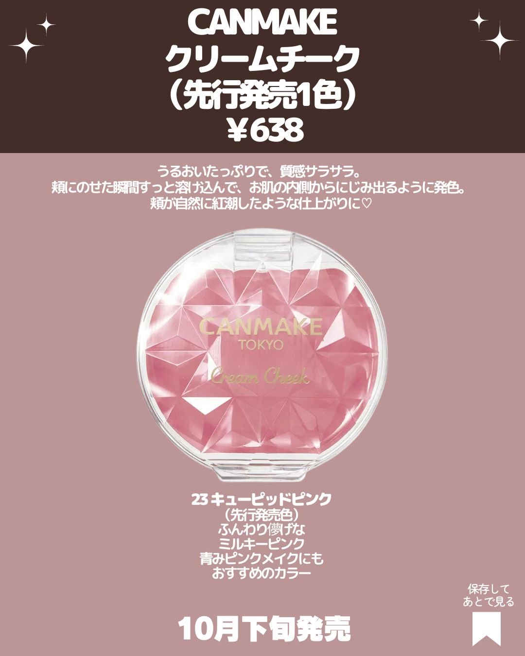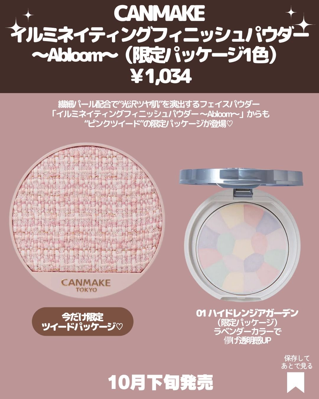 CANMAKE冬の限定&新作発売。10月31日発売のクリームチーク23キューピッドピンク、マシュマロフィニッシュパウダー01ハイドレンジアガーデン(限定ツイード容器)、イルミネイティングフィニッシュパウダー01ディアレストブーケ(限定ツイード容器)。 限定発売の物もあるので欲しい物がある方はお早めのチェックをおすすめします❄️