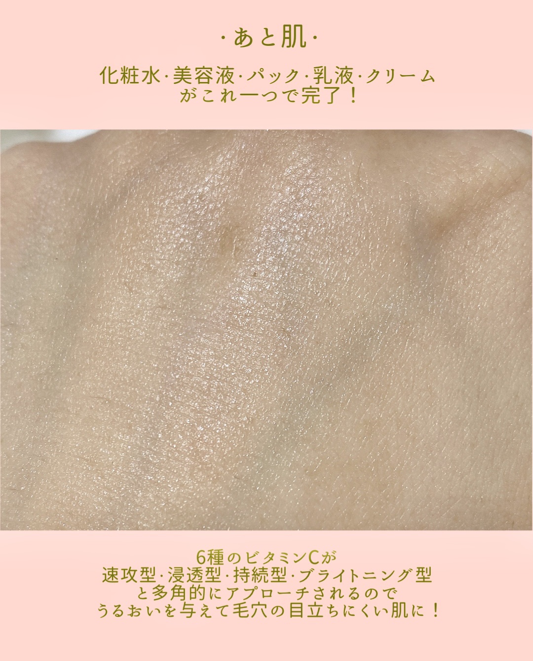 - 6種のビタミン C 誘導体*配合のオールインワンスプレー。 6種配合で多角的にアプローチし、うるおいを与えて毛穴の目立ちにくい肌に。 【速攻型・浸透型・持続型・ブライトニング ビタミン C 誘導体】 洗顔後にスプレーするだけで5つのステップが3秒で完結。【化粧水・美容液・パック・乳液・クリーム】 高保湿乳液をナノサイズにする独自技術で、水分と油分が分かれることなく肌に浸透してしっとりもちもち肌が続く。 大豆種子エキス**・アーチチョーク葉エキス・CICA(ツボクサエキス)・レモン果実エキスといった植物由来の保湿成分を配合。 無着色、無鉱物オイル、無エチルアルコール。柑橘系の香り。 最後まで使用するためにボトルを振らずにご使用ください。 *アスコルビルグルコシド、アスコルビルリン酸 Na、パルミチン酸アスコルビルリン酸3Na、リン酸アスコルビル Mg、テトラヘキシルデカン酸アスコルビル、ミリスチル 3-グリセリルアスコルビン酸(保湿成分) **ダイズ種子エキス