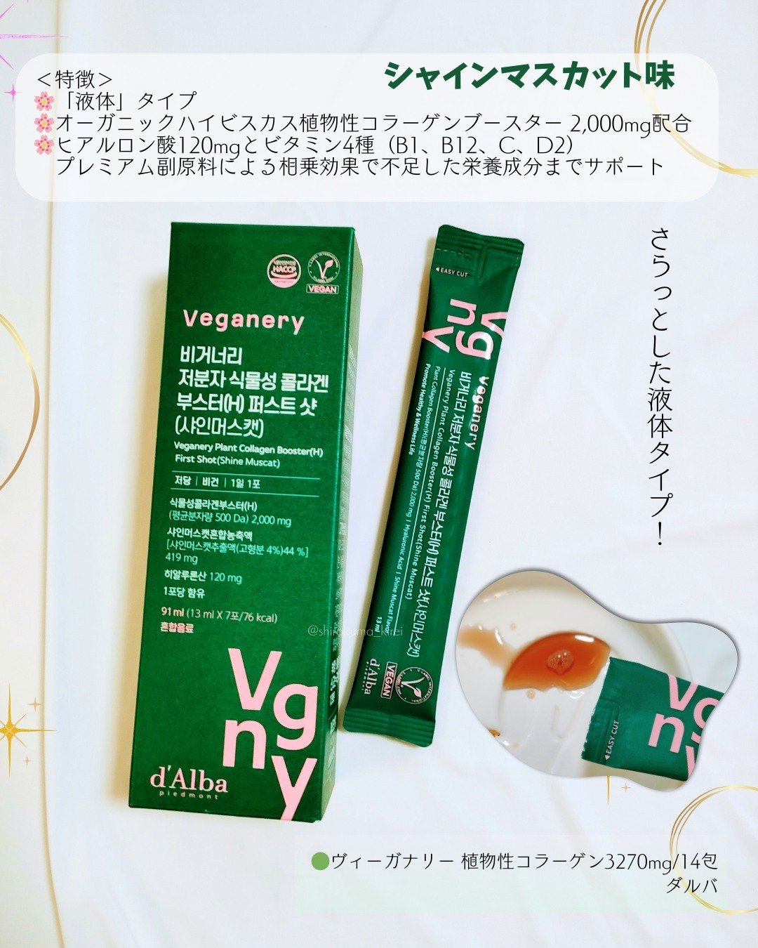 1日1包でコラーゲンからヒアルロン酸、ビタミンまで摂取できる❣️ 植物性の高吸収ビーガンコラーゲン✨ シャインマスカットフレーバーで美味しいの❣️ オーガニックハイビスカスから抽出した100%ヴィーガン植物性コラーゲンブースター 2,000mgで、低分子コラーゲンブースターで高吸収👏✨