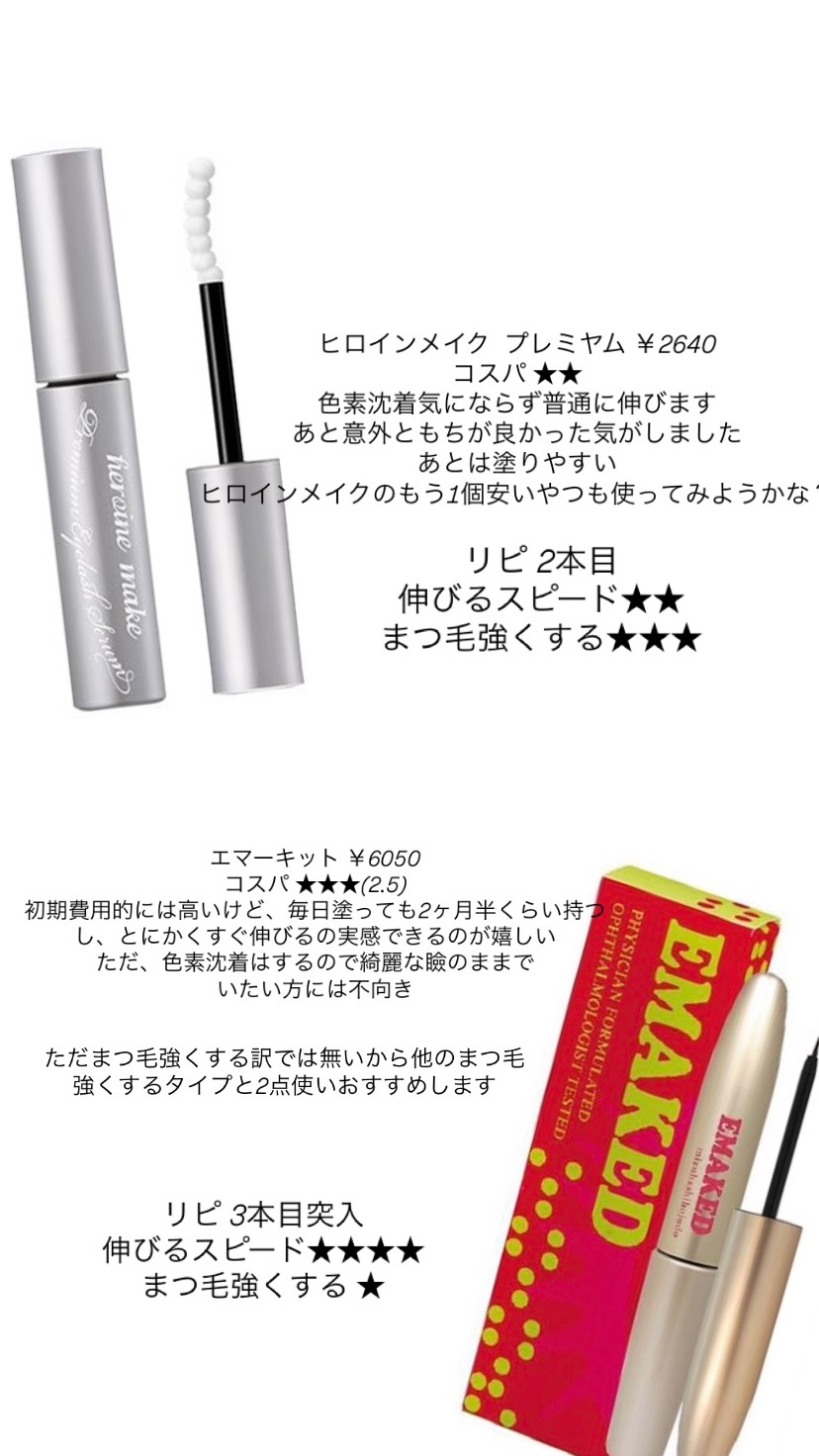 私的順位⤵︎ ︎ 1位 ラッシュジェリードロップEX(マジョマジョ) 2位 CEZANNEまつげ美容液EX 3位 アイラッシュセラム プレミアムEX(ヒロインメイク) マジョマジョの1045円の方がコスパ的にもまつ毛的にも良かったです 個人差があると思うので、これがおすすめ!っていって合わない方がいたら申し訳ないんですが