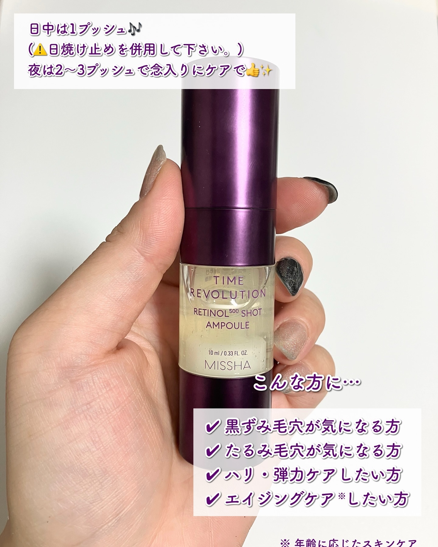 レチノール×10種の発酵成分でWアプローチ MISSHAの浸透テクノロジー「生レチKEEP製法」で、不安定で水に溶けにくいレチノールをリポソーム化。 10mlだから、月1本使う感じで間をあけて使用してます♡