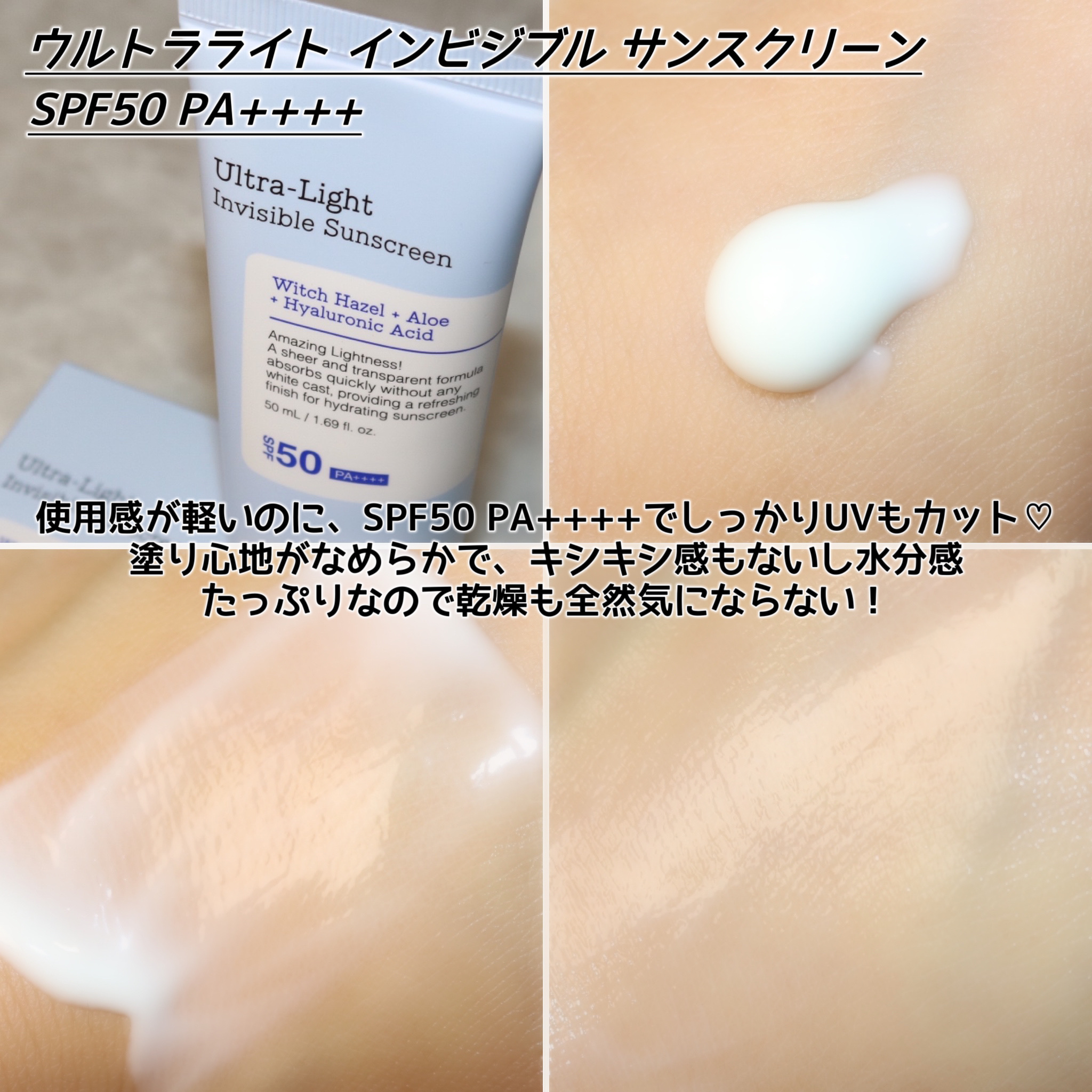 「cosrxのウルトラライトインビジブルサンスクリーンをお迎えしました💛名前の通り、超軽量で塗っても重さを感じないのがポイント✨透明感があって白浮きせず、肌に自然に馴染むのでメイク前の下地にもぴったり🙆さらにSPF50+PA++++で日常使い...