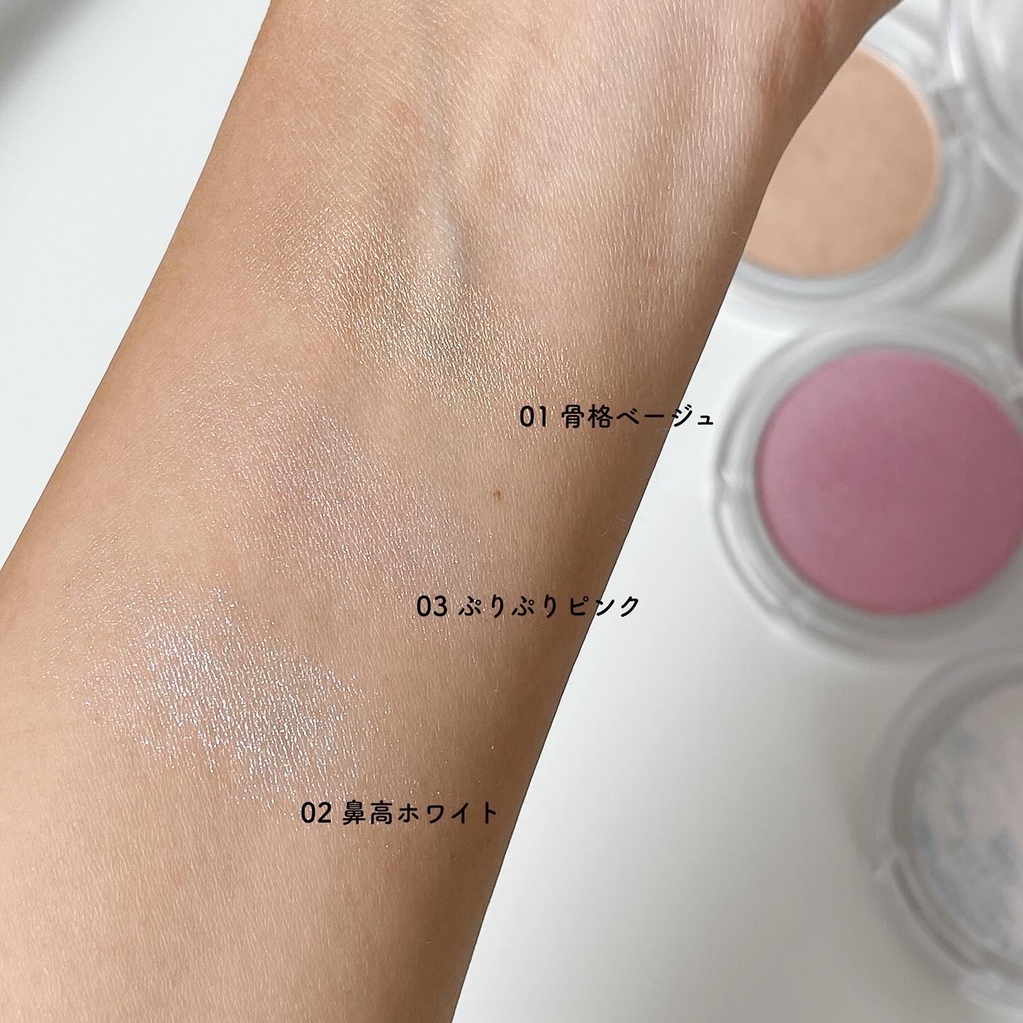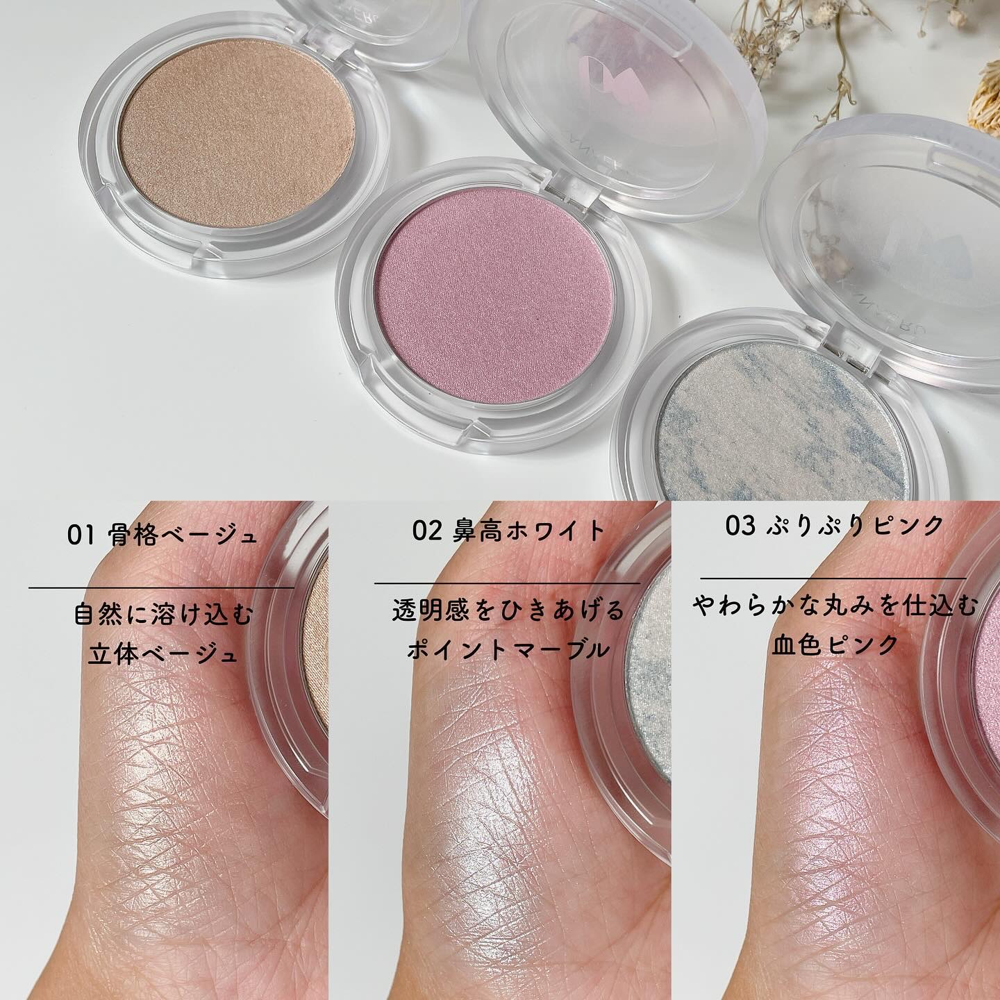 新作パウダーハイライトが9/12より登場♡ パーツ別に使い分けられる全3色展開です📝 私のお気に入りは02の鼻高ホワイト。ブルーとホワイトのマーブルになっていて透明感と立体感をプラスしてくれます! むにっとしたシルキーなテクスチャーで、しっとりとした密着感が感じられます。