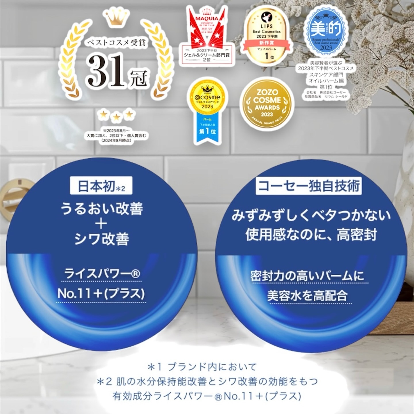 - LIPSベストコスメ2025 フェイスバーム部門1位LIPSベストコスメ2024 総合大賞5位LIPSベストコスメ2024 フェイスバーム部門1位LIPSベストコスメ2023 下半期新作賞 フェイスバーム部門1位LIPS月間トレンド賞2024年10月 スキンケア部門3位LIPS月間トレンド賞2023年10月 スキンケア部門1位