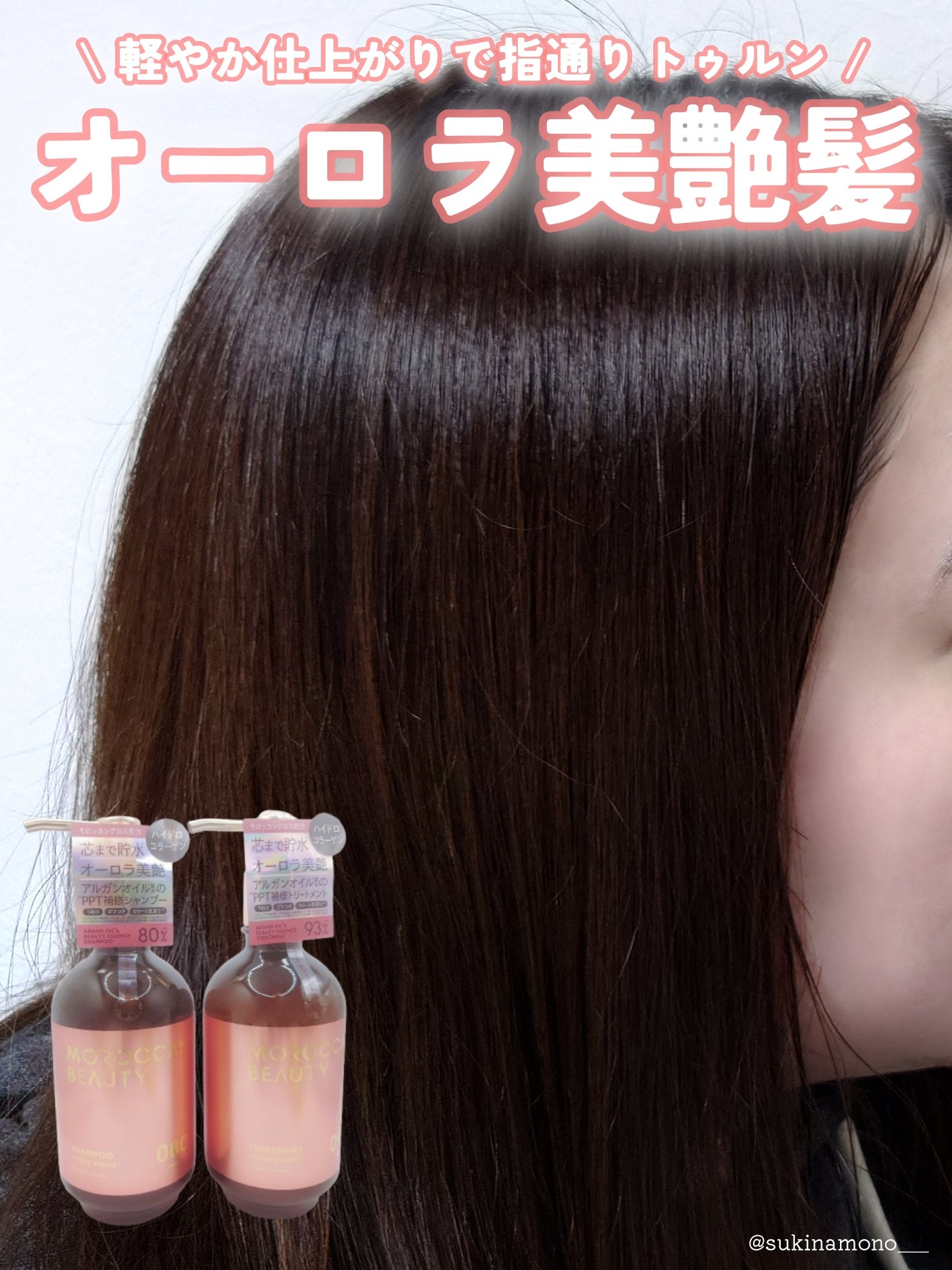 - うねり髪を科学する、アルガンオイル*¹配合のPPT補修*²シャンプー&トリートメント。モロッコ産のアルガンオイル*¹をはじめとする厳選した美髪成分*³に、PPT補修成分*²とハイドロコラーゲン*⁴をプラス。髪の芯まで貯水*⁵する「モロッカングロス処方」で、うねり・広がり・ゴワつきに加えて、ヘアカラーの色落ち*⁶もケアします。ダメージによる髪のくすみとツヤを補修し、オーロラのように美しく輝く艶髪へ導きます。プリズムローズの香り。 *1 アルガニアスピノサ核油(保湿) *2 加水分解シルク、ヒドロキシプロピルトリモニウム加水分解シルク(全て保湿) *3 アルガニアスピノサ核油、オプンチアフィクスインジカ種子油、アルガニアスピノサカルス培養エキス、センチフォリアバラ花油(全て保湿) *4 加水分解コラーゲン(保湿) *5 潤いを保つこと *6 ヘアカラーの色落ち緩和
